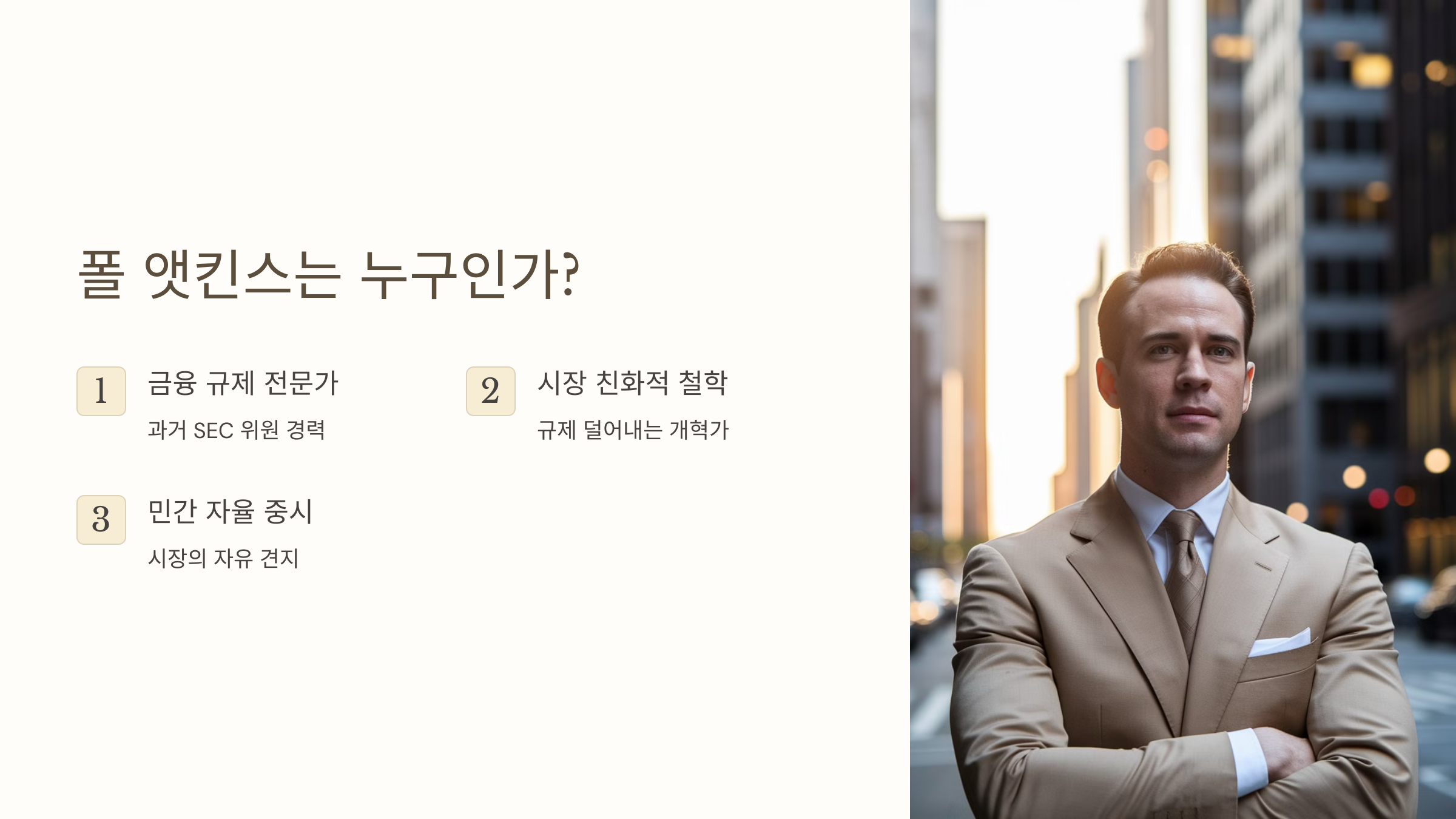 폴 앳킨스는 미국 금융 규제 분야에서 오랜 경험을 쌓아온 인물로, 과거 SEC 위원으로 재직하면서