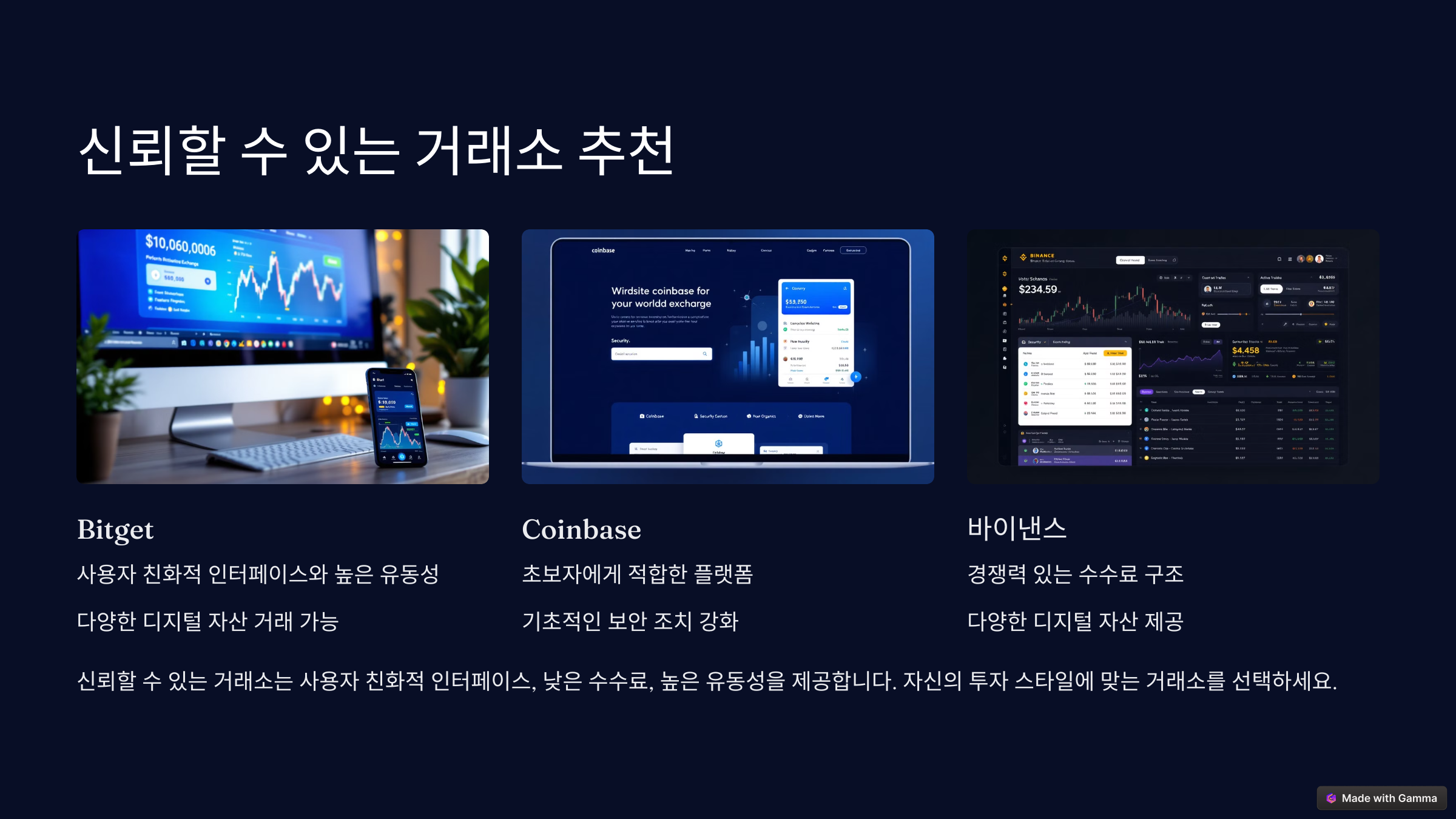 안전한 거래소는 사용자 친화적인 인터페이스와 강력한 보안 기능을 제공합니다. 예를 들어, Bitget은 거래 과정을 간편하게 만들어 주며, Coinbase는 초보자에게 적합한 플랫폼으로 기초적인 보안 조치를 강화하여 안전한 거래를 보장합니다.