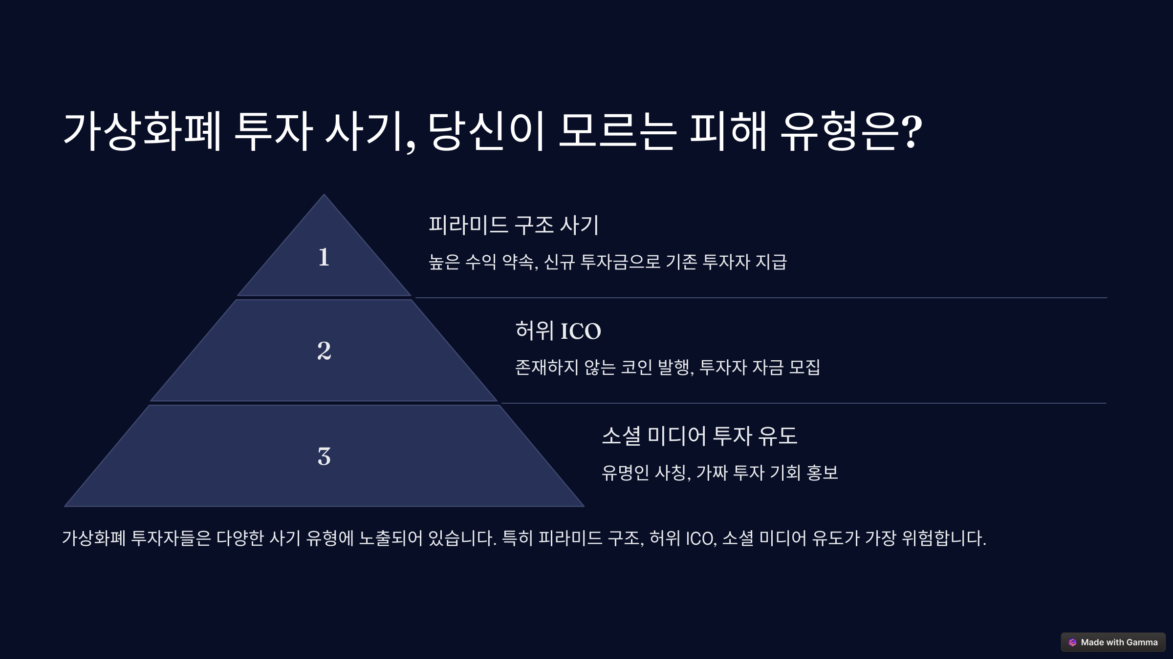 가상화폐 투자 사기 중 가장 위험한 유형 중 하나는 피라미드 구조를 이용한 사기입니다. 이 방식은 투자자에게 높은 수익을 약속하지만, 실제로는 신규 투자자의 돈으로 기존 투자자에게 지급되는 구조입니다. 이러한 방식은 지속 가능성이 없으며, 결국 막대한 피해를 초래할 수 있습니다. 미국 증권거래위원회(SEC)는 이러한 사기를 "교과서적인 피라미드 겸 폰지 사기"라고 지적하며, 투자자들은 항상 경계해야 합니다.