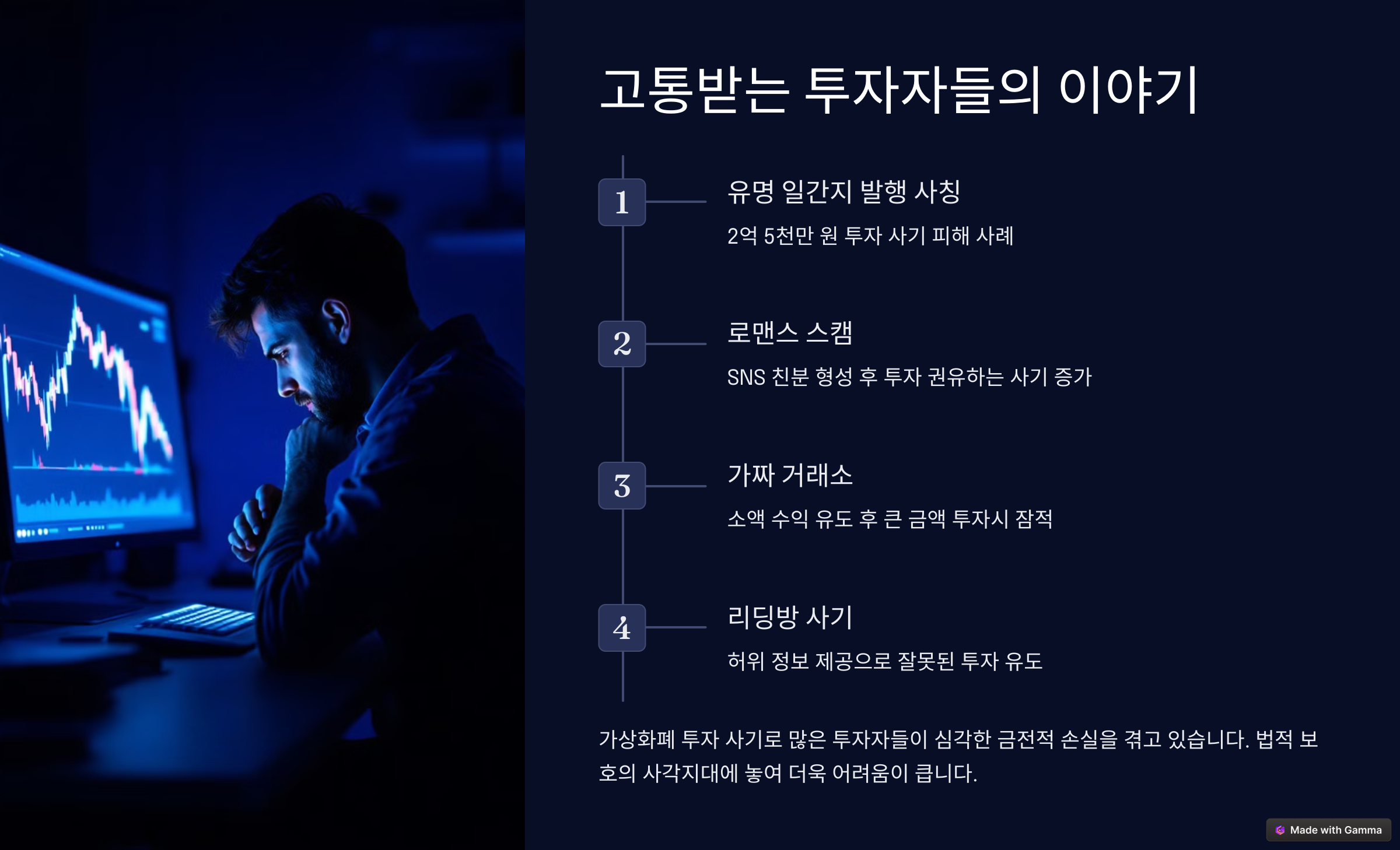 최근 가상화폐 투자 사기로 인해 많은 투자자들이 심각한 금전적 손실을 겪고 있습니다. 특히 법적 보호의 사각지대에 놓여 있다는 점은 더욱 우려스러운 상황입니다.