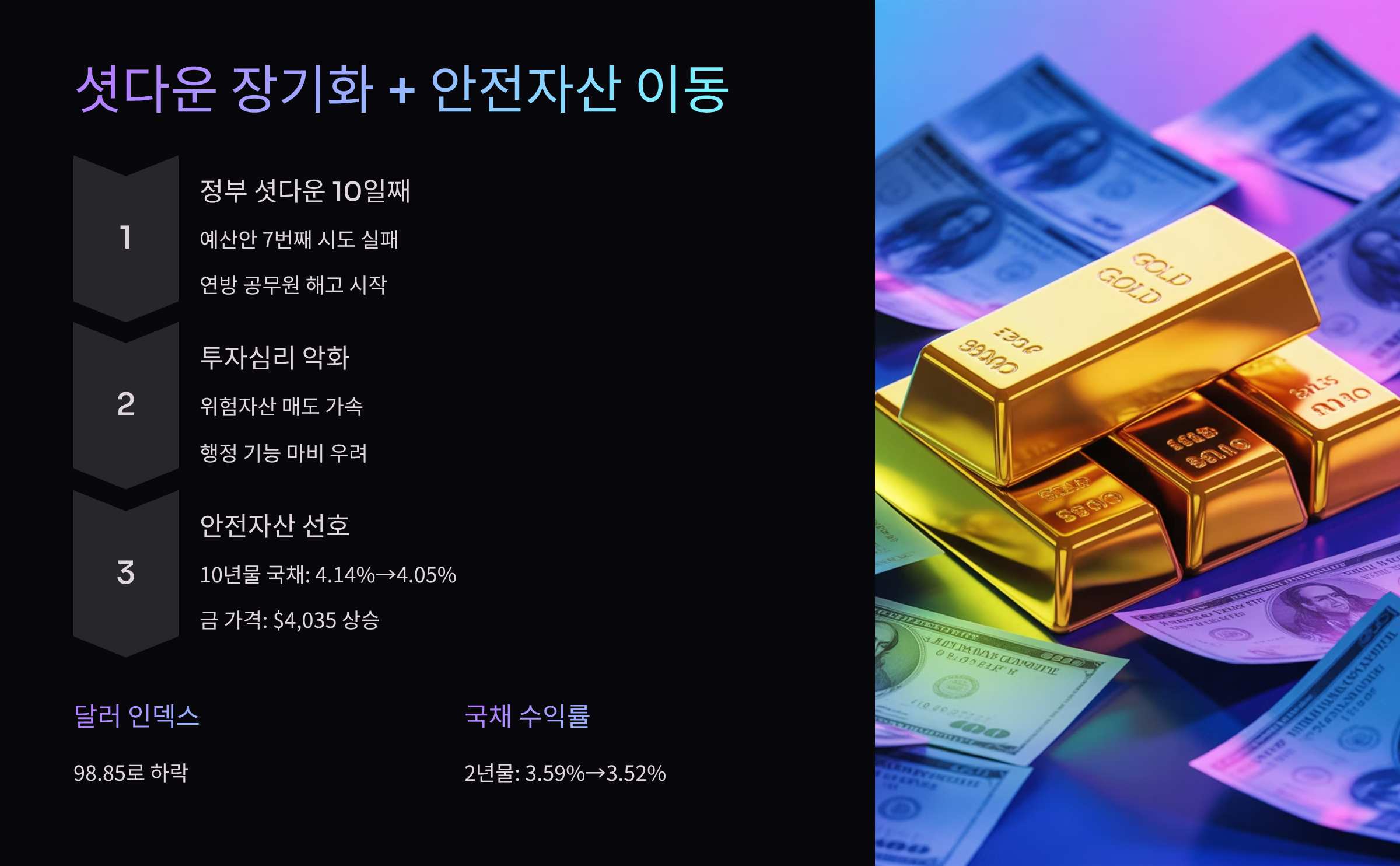 위험회피 심리가 강해지면서 투자자들이 안전자산인 금으로 이동했고, 달러 자산 매도가 늘면서 달러 인덱스가 하락한 결과입니다. 통상적으로 금과 달러는 반대로 움직이는 경향이 있습니다.
