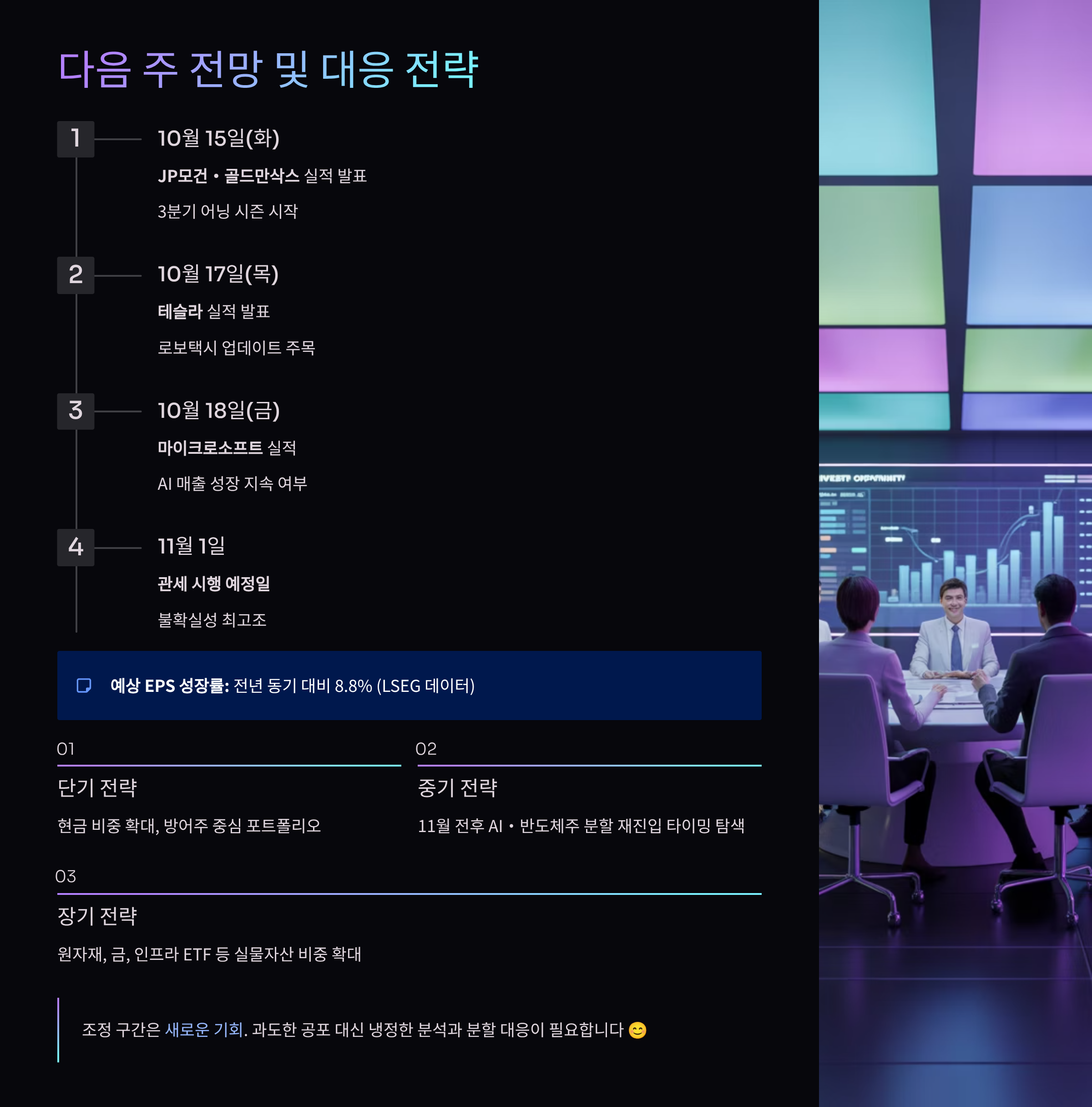 - 2️⃣ 중기: 11월 관세 시행 전후로 AI·반도체주 분할 재진입 타이밍 탐색