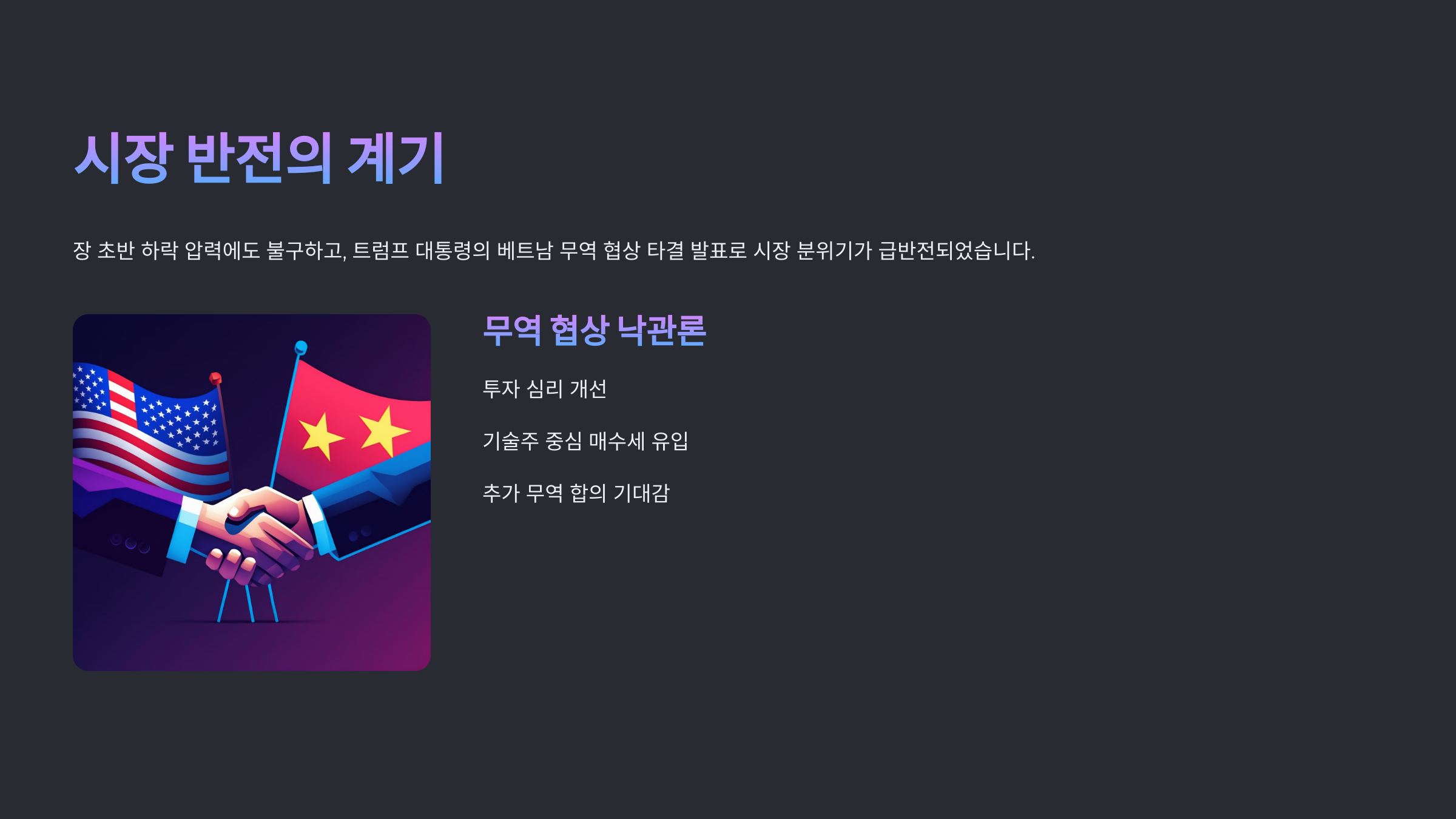 트럼프 대통령이 베트남과의 무역 협상 타결을 발표하면서 시장 분위기가 급변했습니다.