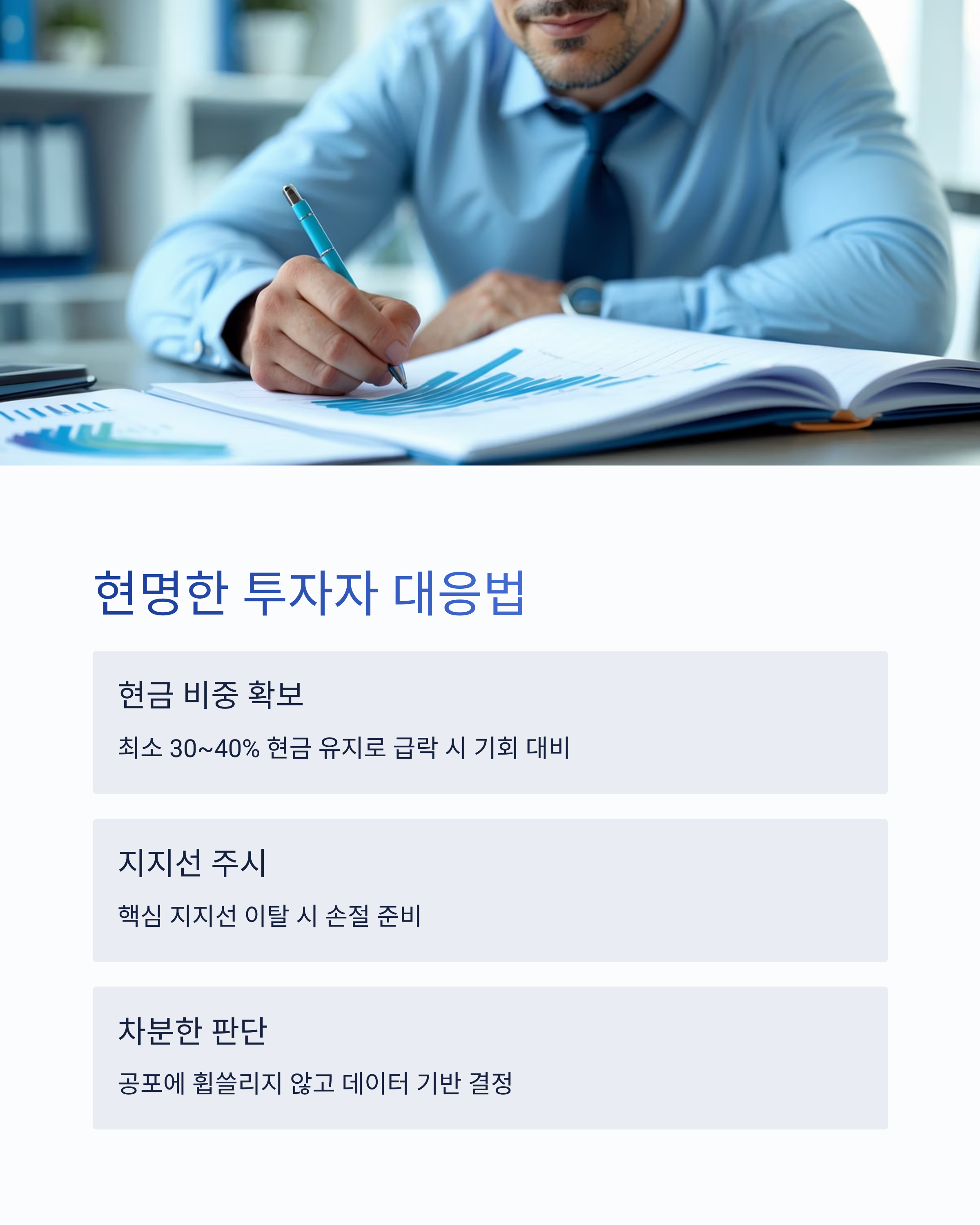 최소 30~40%는 현금으로 확보해두는 게 좋아요. 급락 시 기회를 잡을 수 있는 유연성을 확보하는 것이 지금 같은 시장에선 더 중요해요.