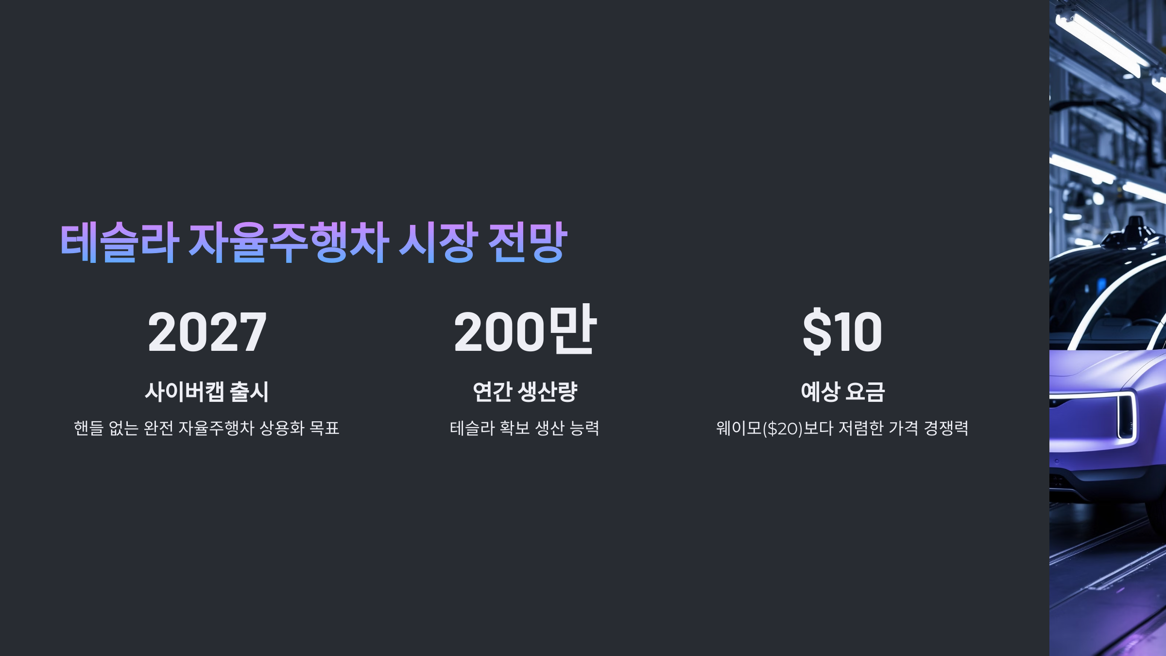 - 테슬라 효과: 사이버캡 출시 속도 가속, 시장 선점 가능성 확대