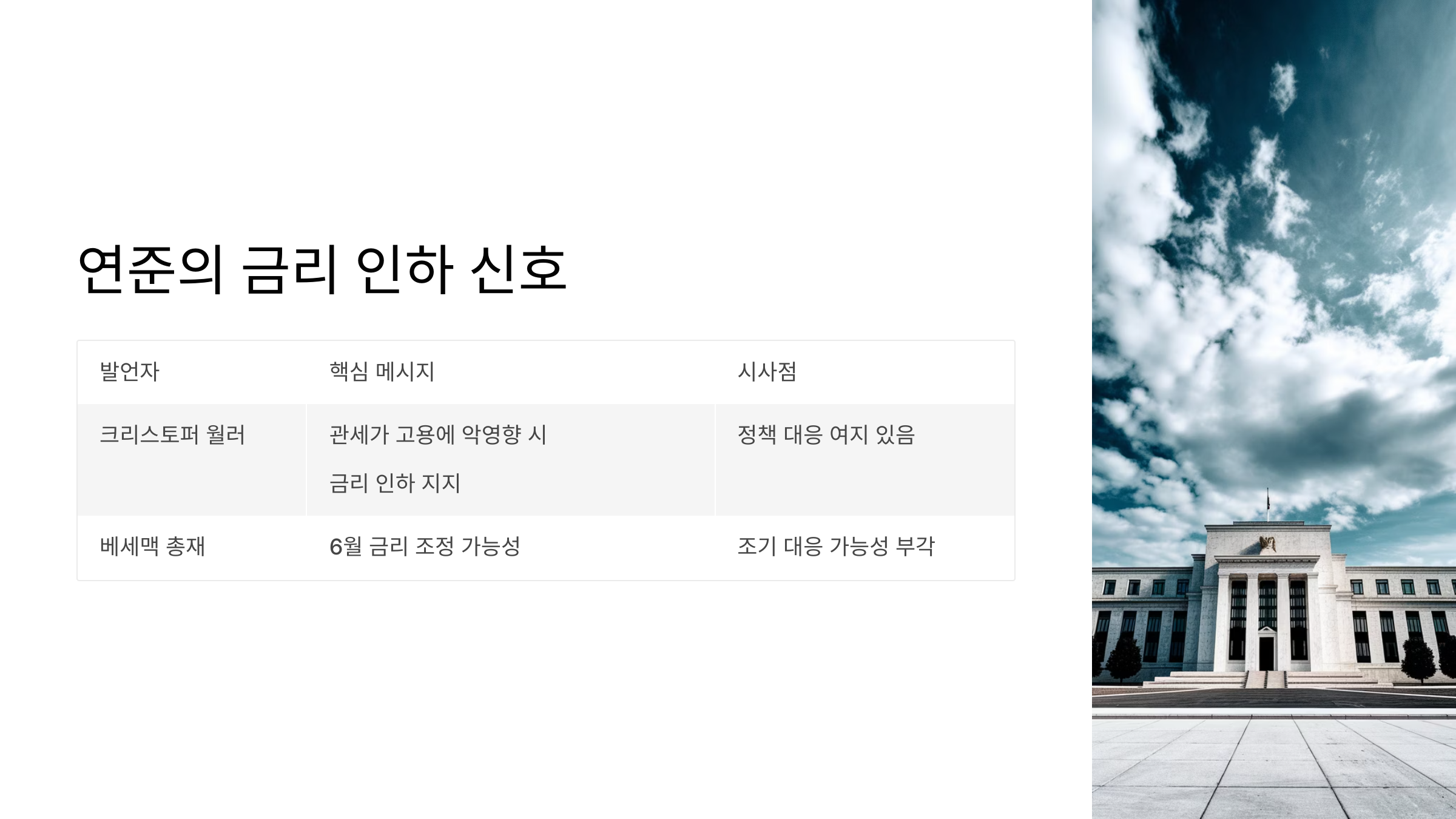 | 크리스토퍼 월러 | 관세가 고용에 악영향 시 금리 인하 지지 | 정책 대응 여지 있음 |