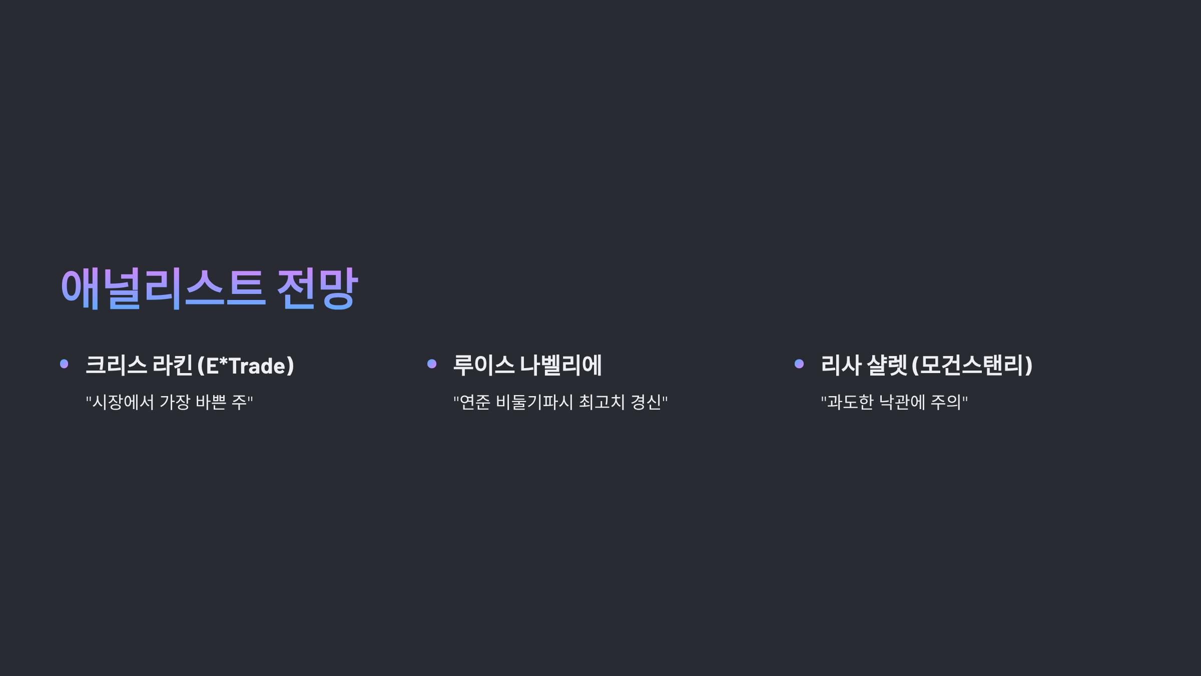 월가 주요 애널리스트들은 신중한 낙관론과 경고를 동시에 전했습니다.