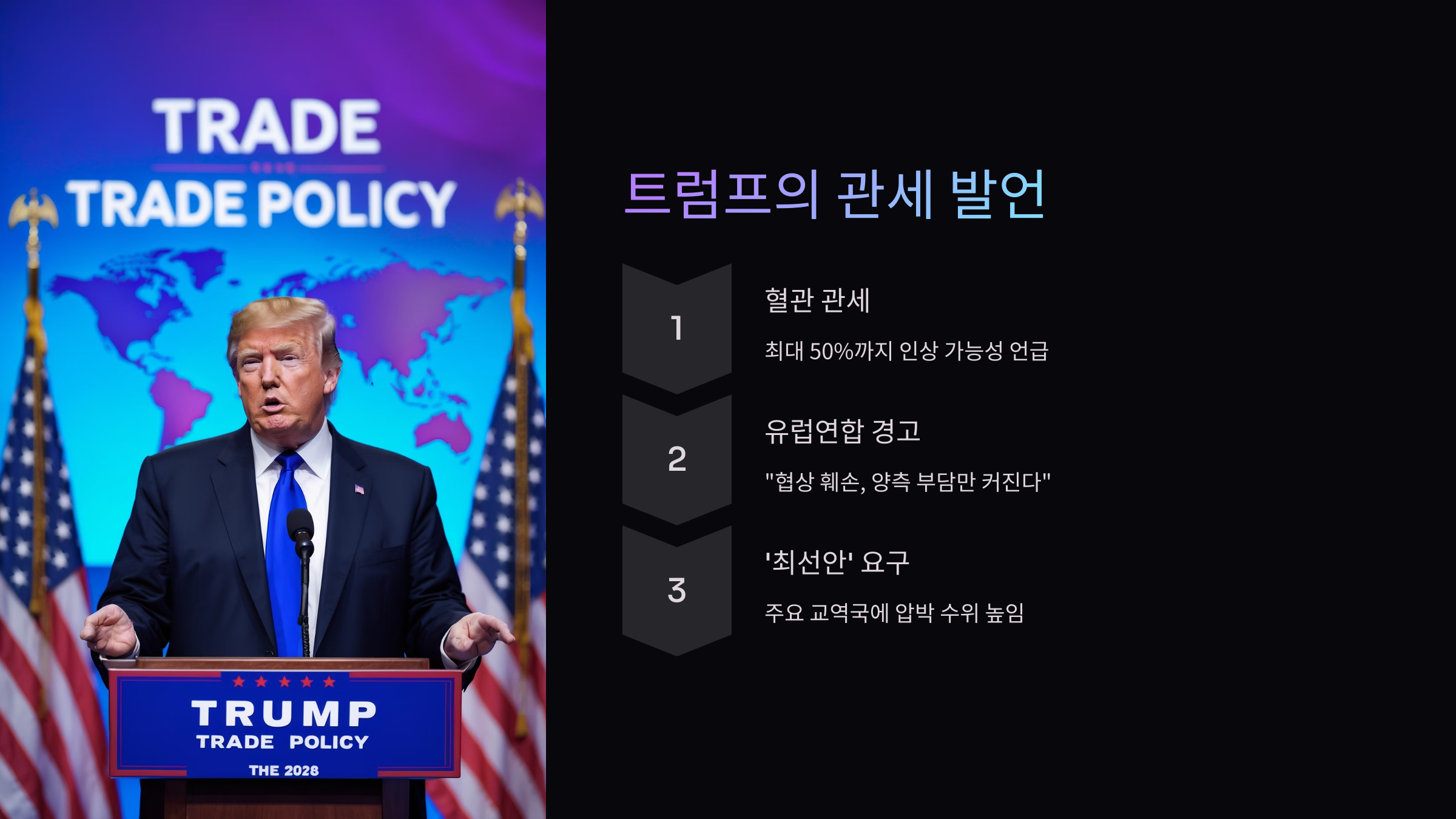 그는 최근 혈관 관세(vascular tariff)를 최대 50%까지 인상할 수 있다고 발언하며,