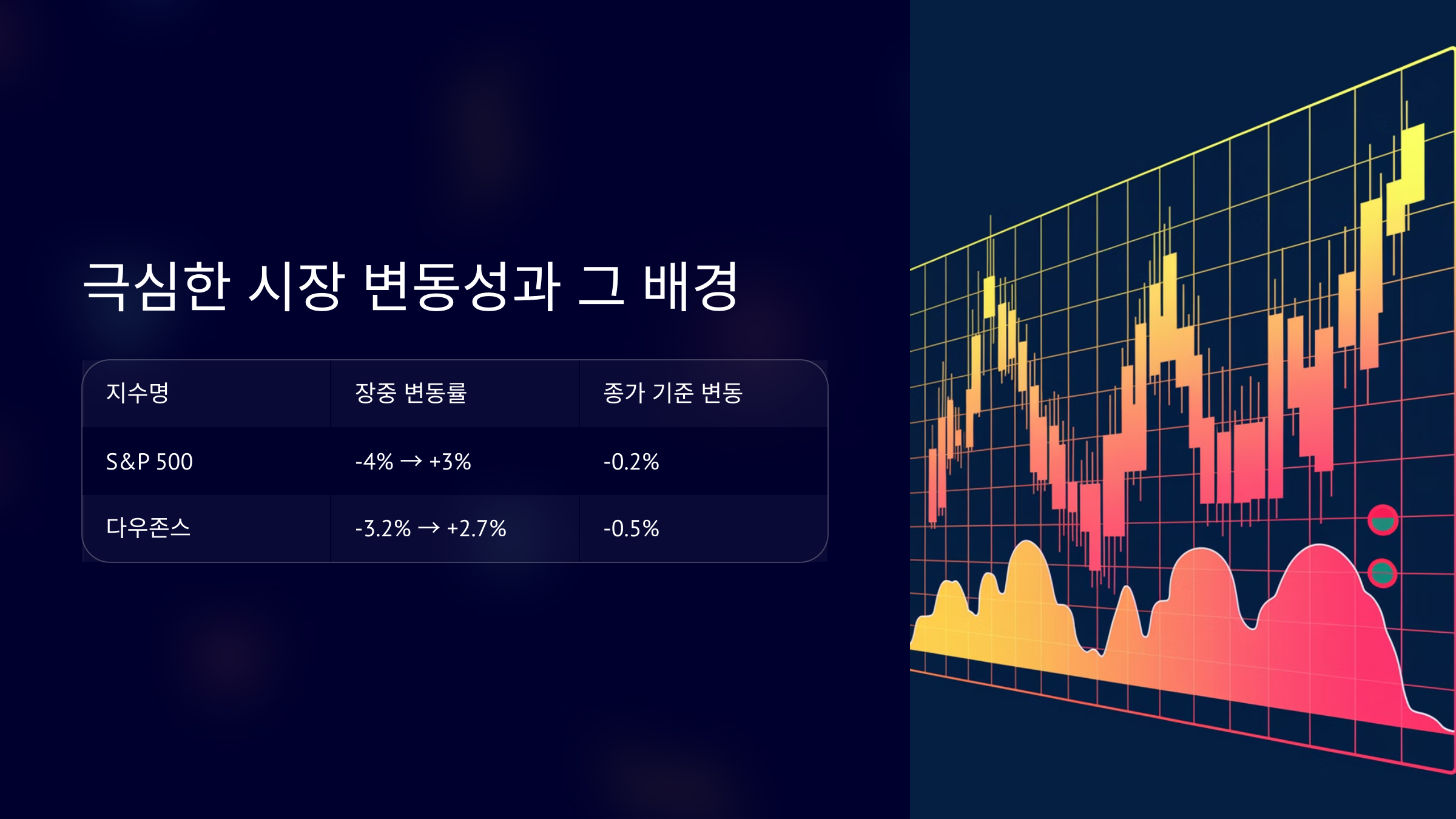 | 다우존스 | -3.2% → +2.7% | -0.5% |