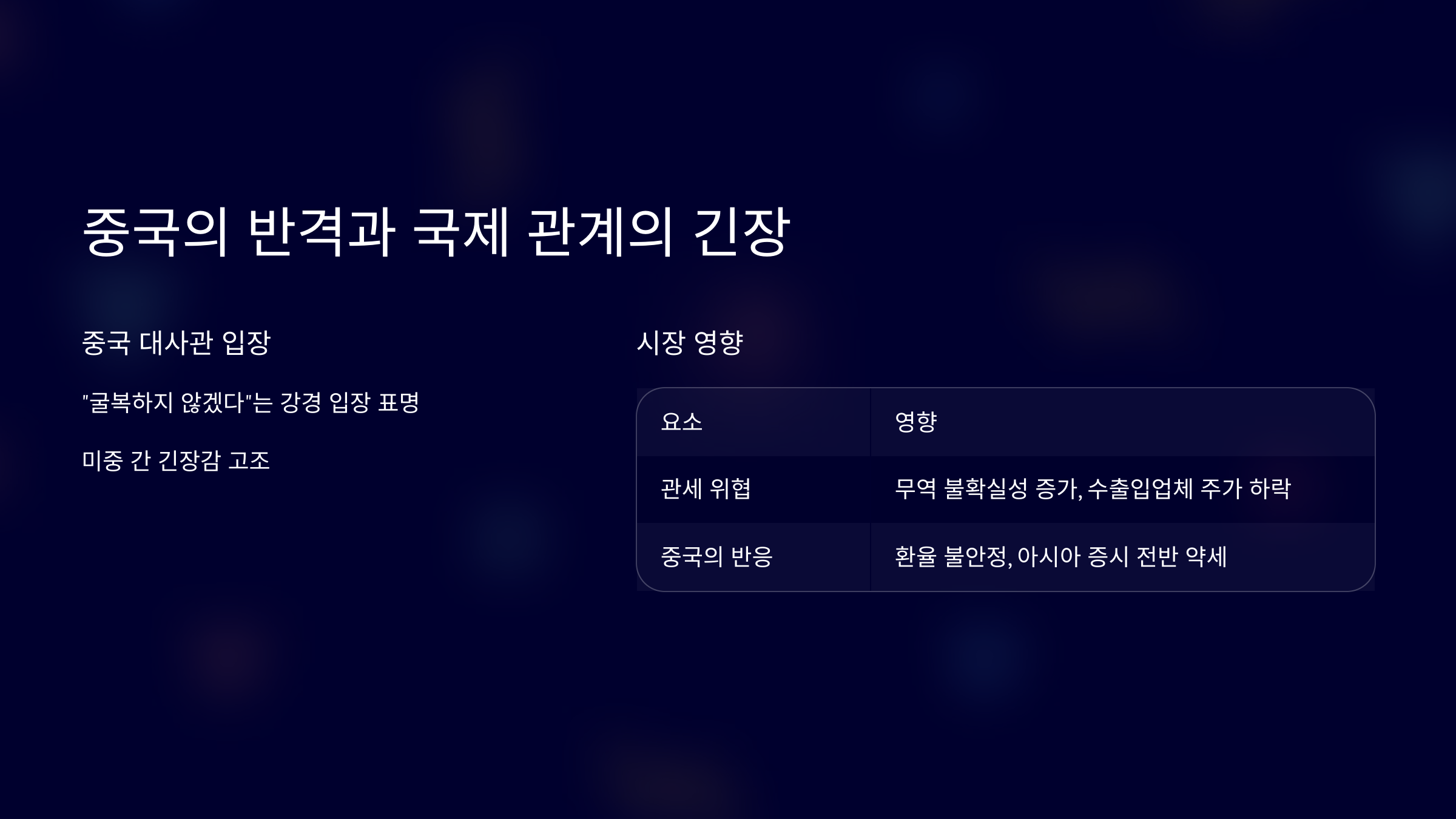 이러한 외교적 대립이 금융시장에 미치는 영향은 다음 표와 같이 정리해 볼 수 있어요.
