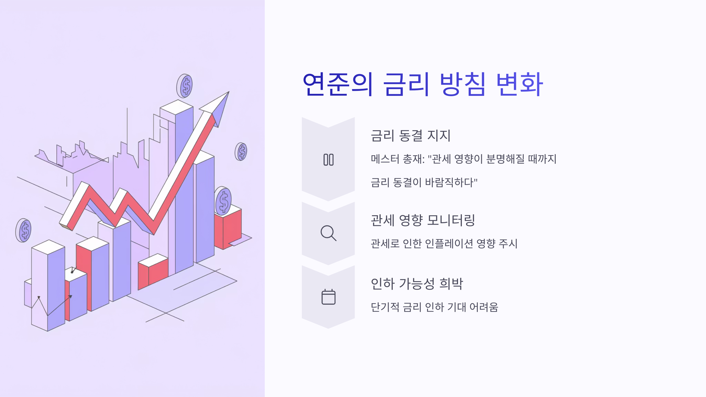 관세발 인플레이션 등 불확실성 때문에 인하를 미루는 분위기입니다.