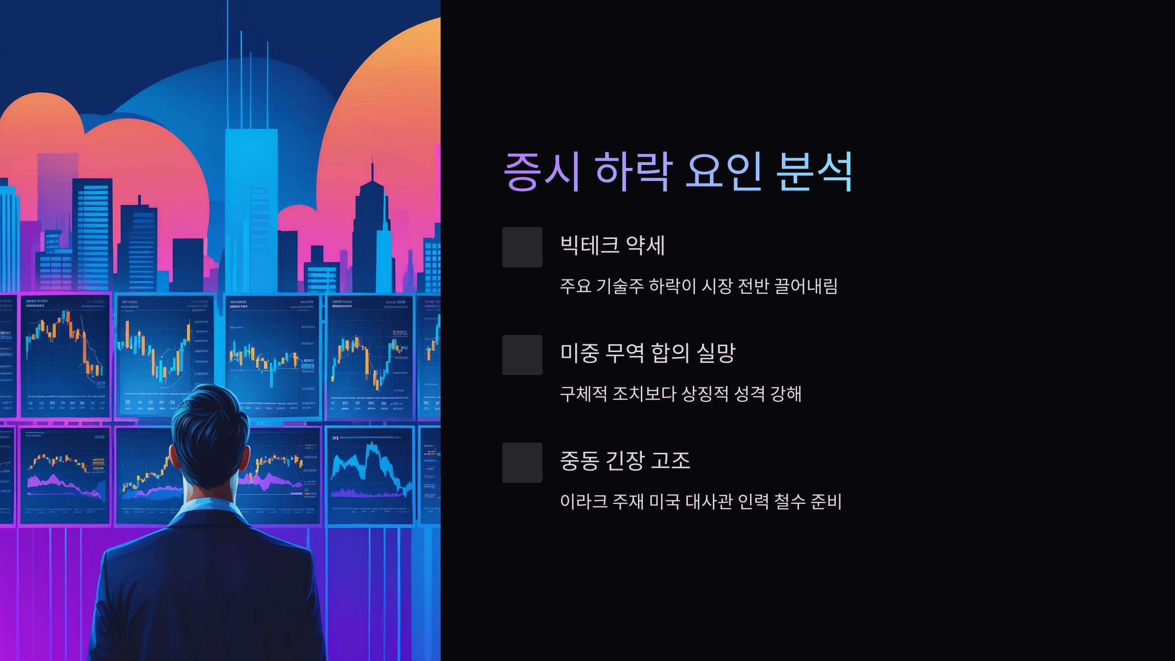 빅테크 약세, 미중 무역 합의의 실망감, 그리고 중동 긴장으로 인한 유가 급등이 복합적으로 작용하면서 투자 심리가 위축되었기 때문입니다.