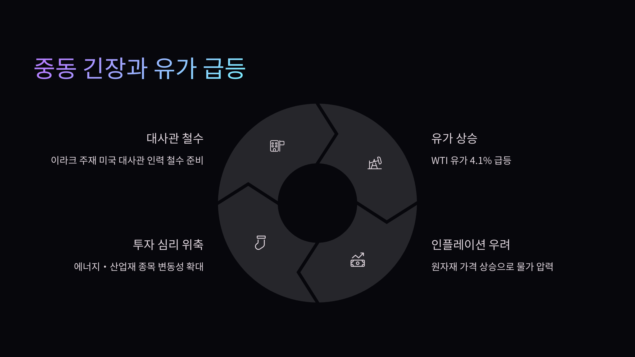 미국의 이라크 대사관 일부 인력 철수 준비 보도가 나오면서 중동 지역 긴장이 고조됐고, 유가가 급등하면서 인플레이션 우려가 재부상했습니다.
