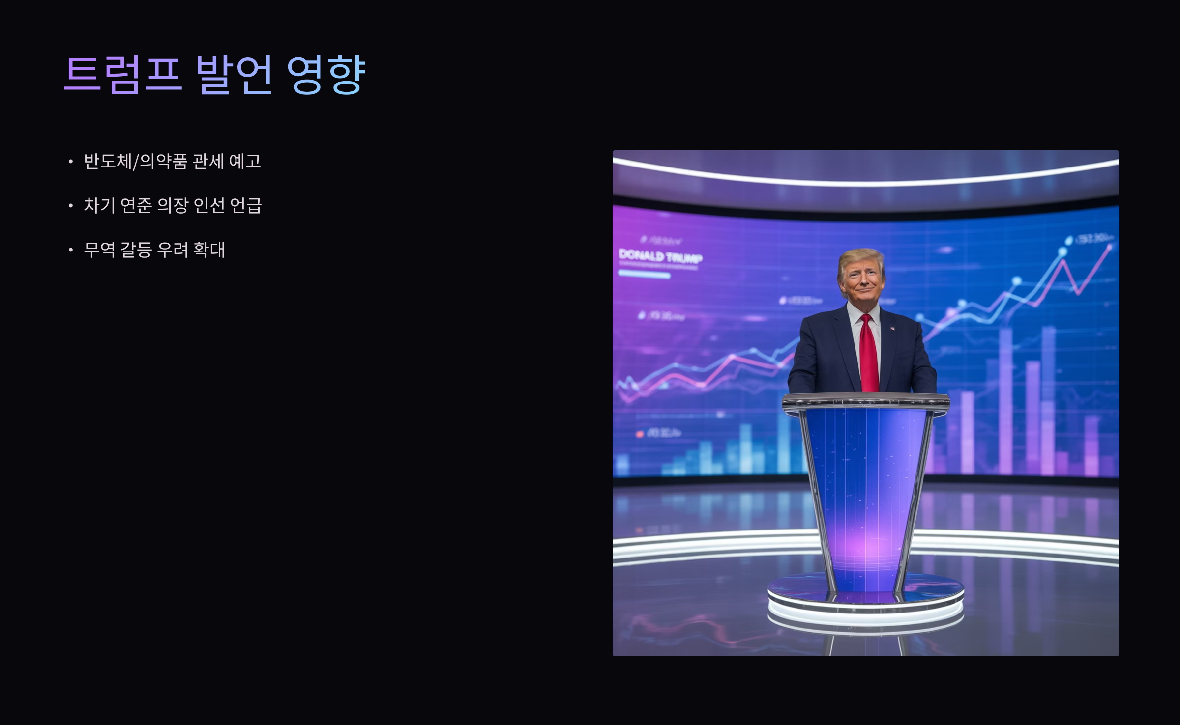 - 반도체 업종: 관세 부과 가능성으로 인해 대형 반도체 종목 중심으로 매도세 확대