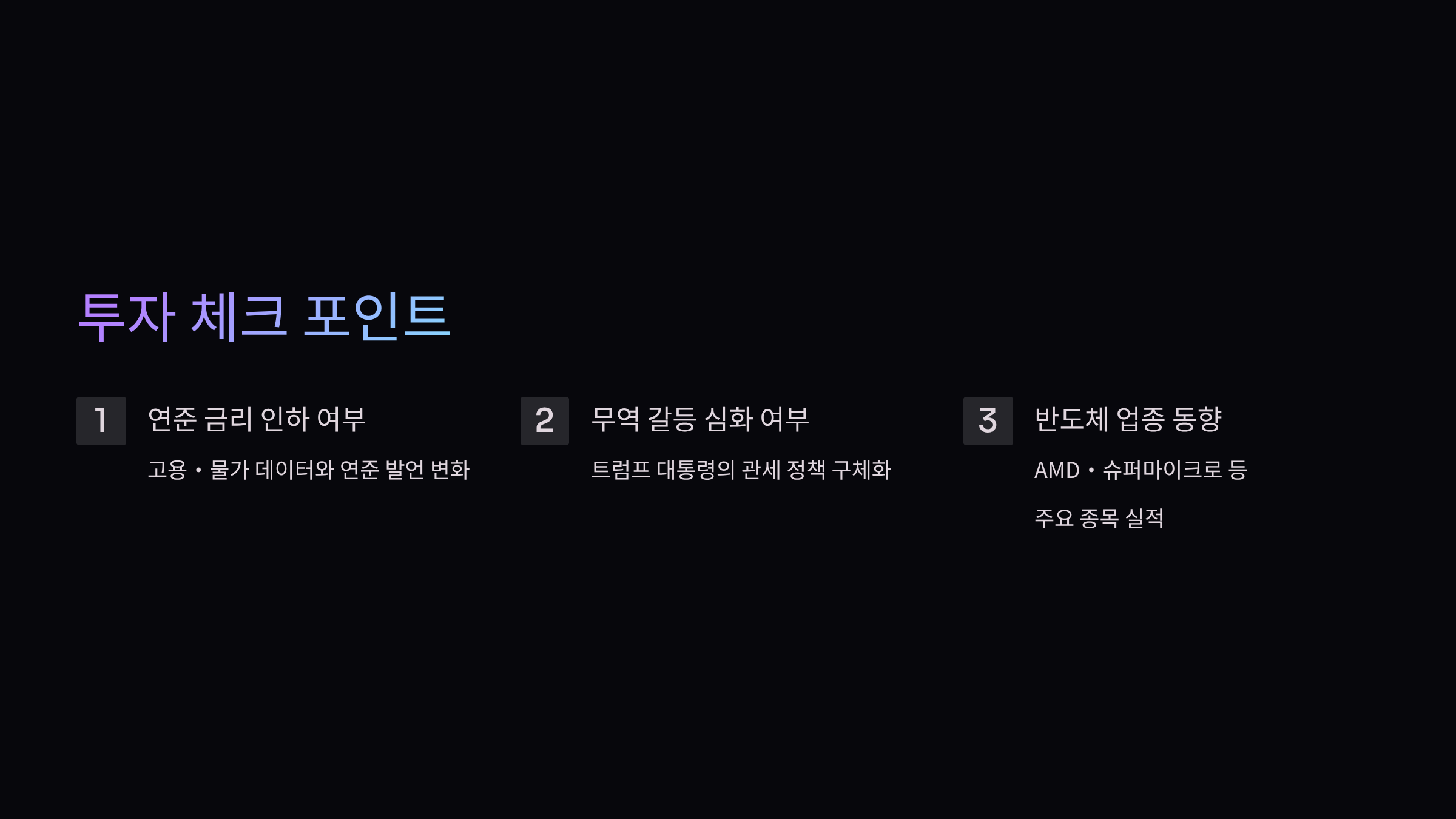 - 반도체 업종: 관세 부과 가능성으로 인해 대형 반도체 종목 중심으로 매도세 확대