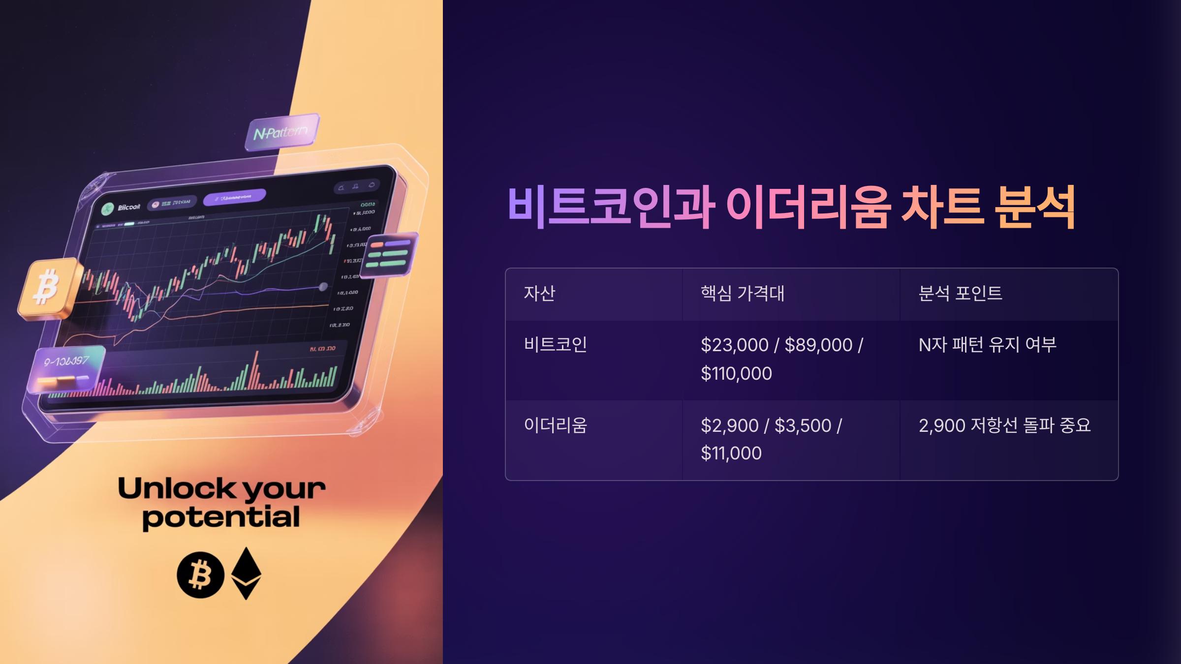 | 비트코인 | $23,000 / $89,000 / $110,000 | N자 패턴 유지 여부가 핵심, 숏과 롱 반복 전략 제시 |