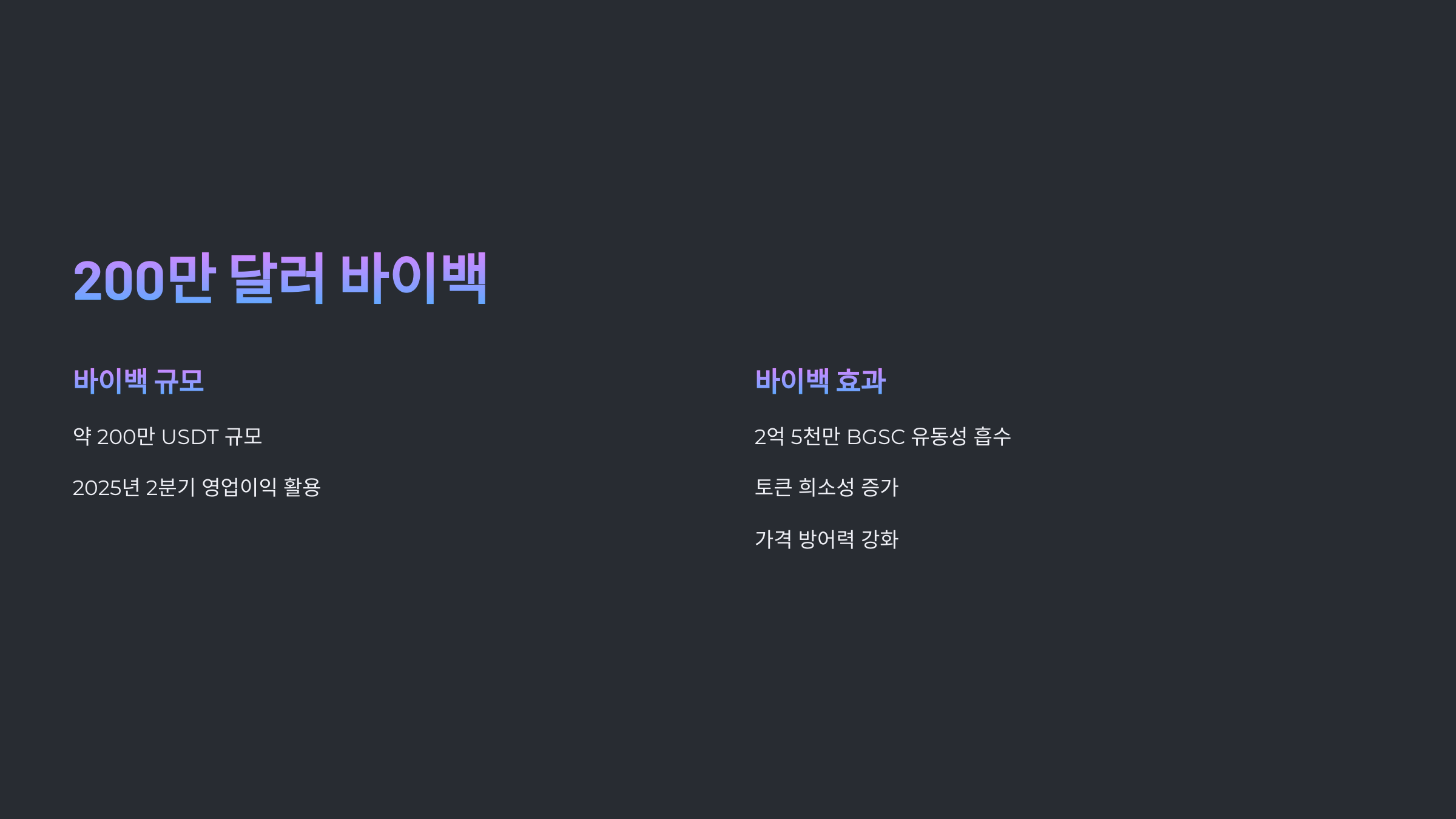 특히, 연이은 바이백과 CEX 유동성 축소는 장기적으로 BGSC 토큰의 시세 안정성을 높이고,