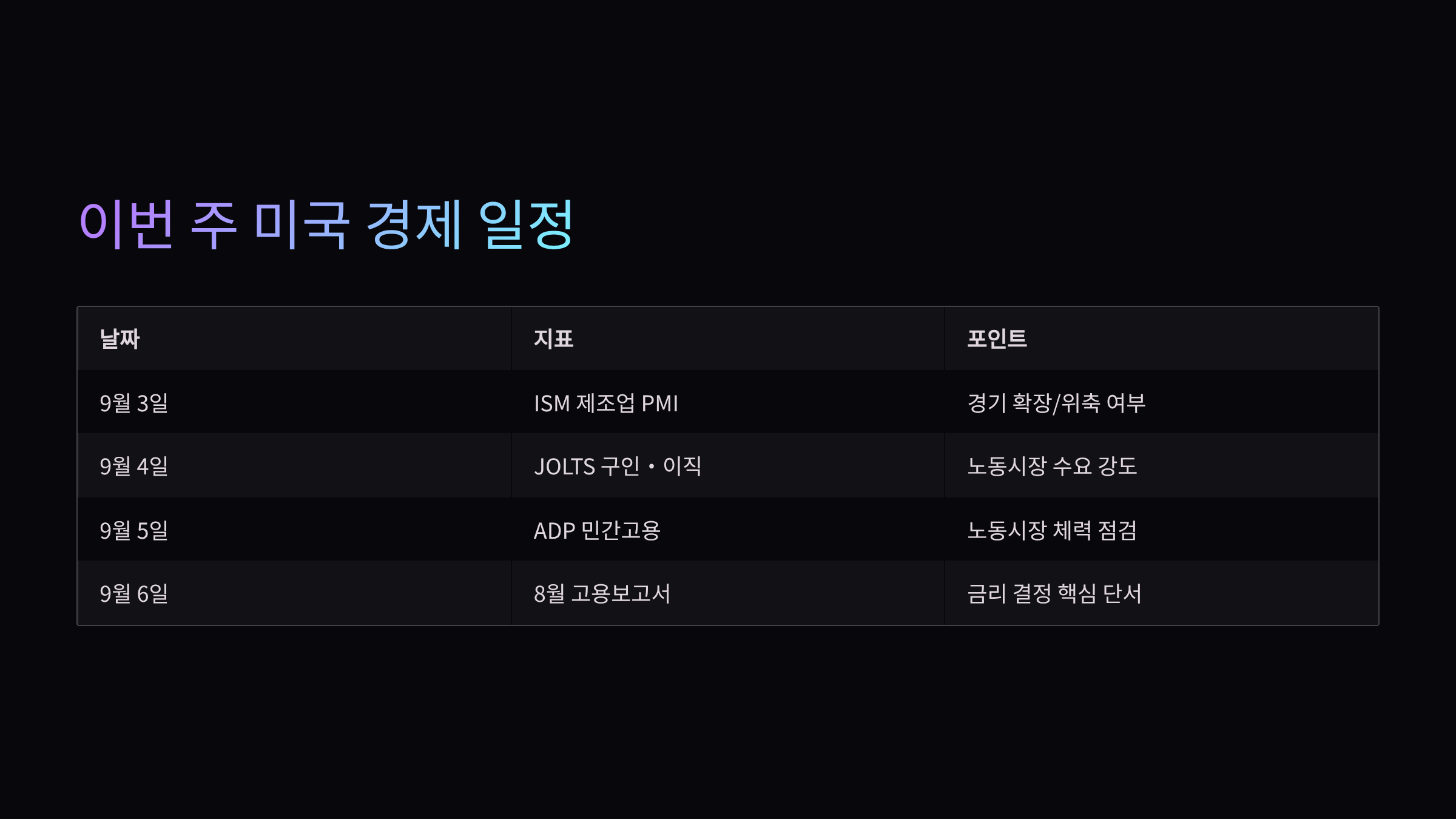 | 9월 5일 | ADP 민간고용·실업수당·서비스업 PMI | 노동시장 전반 체력 점검 |