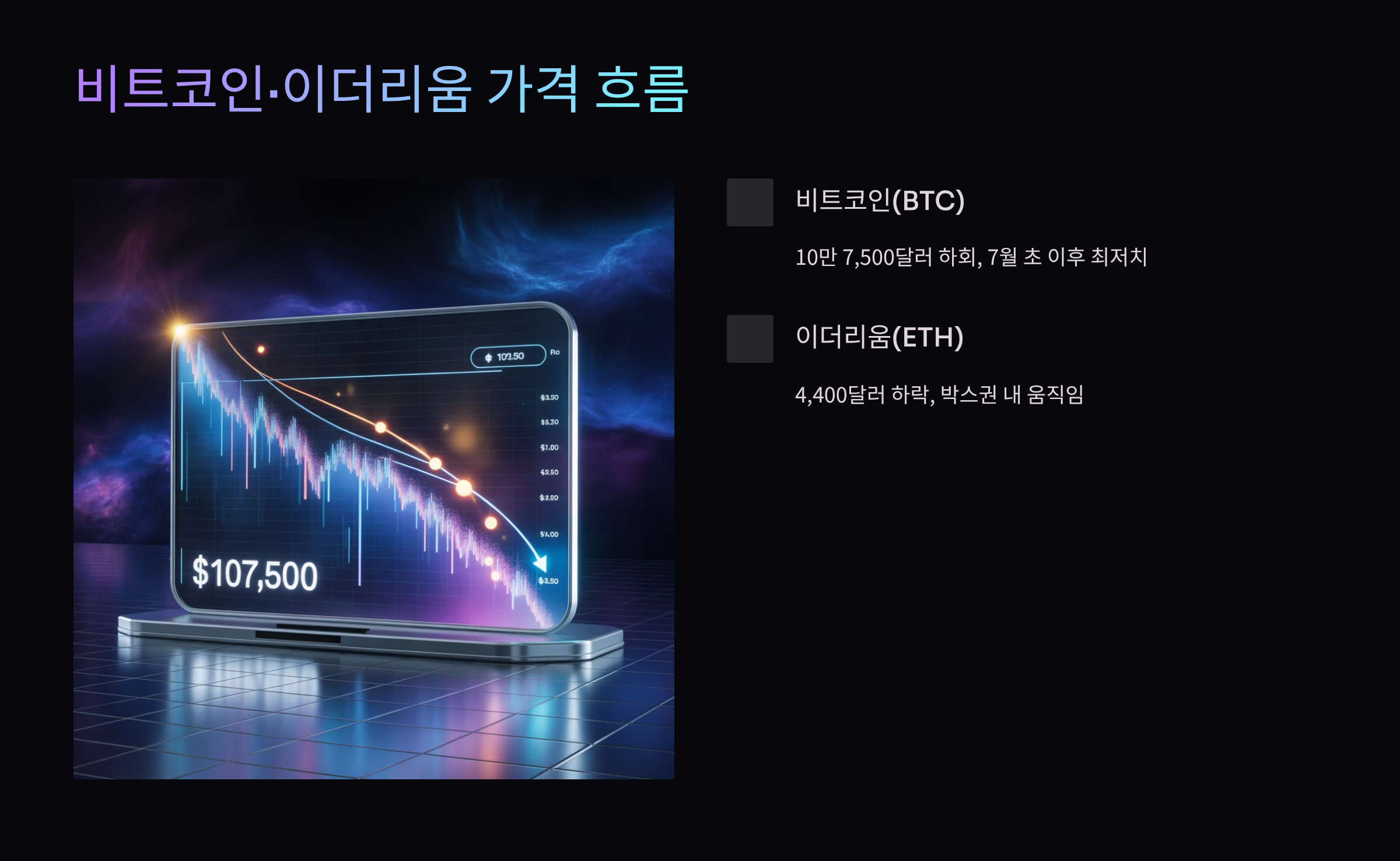 - 비트코인(BTC): 10만 7,500달러 하회, 7월 초 이후 최저치