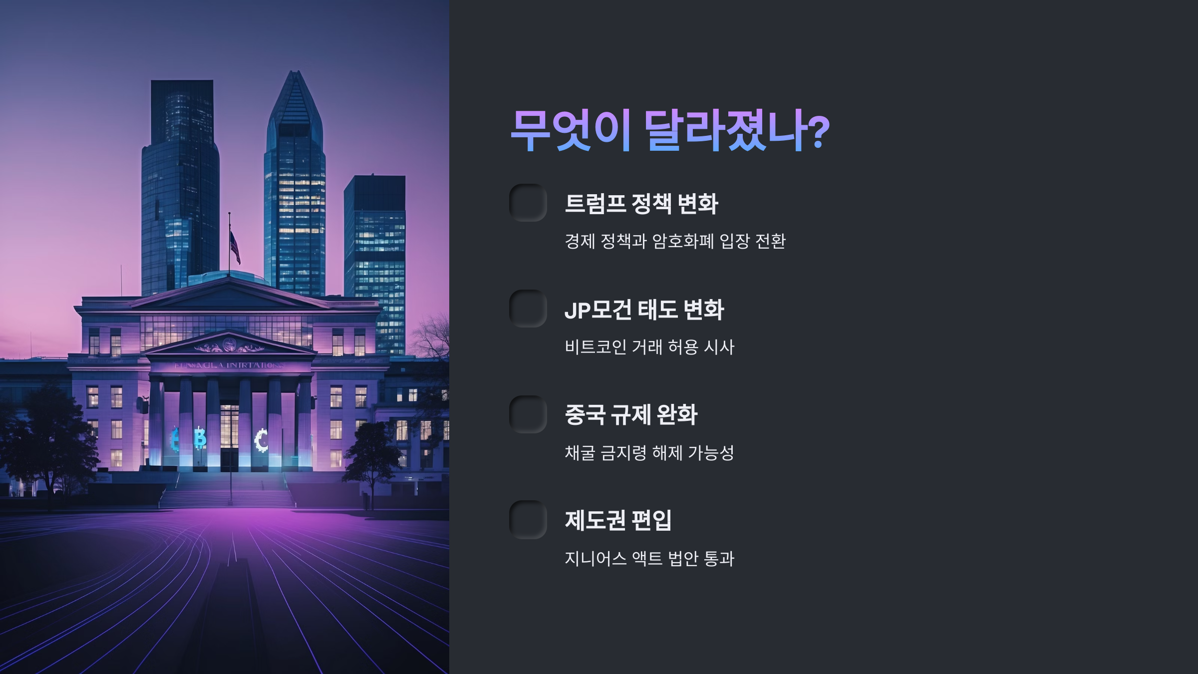 트럼프의 발언, JP모건의 움직임, 스테이블 코인 법안 통과,