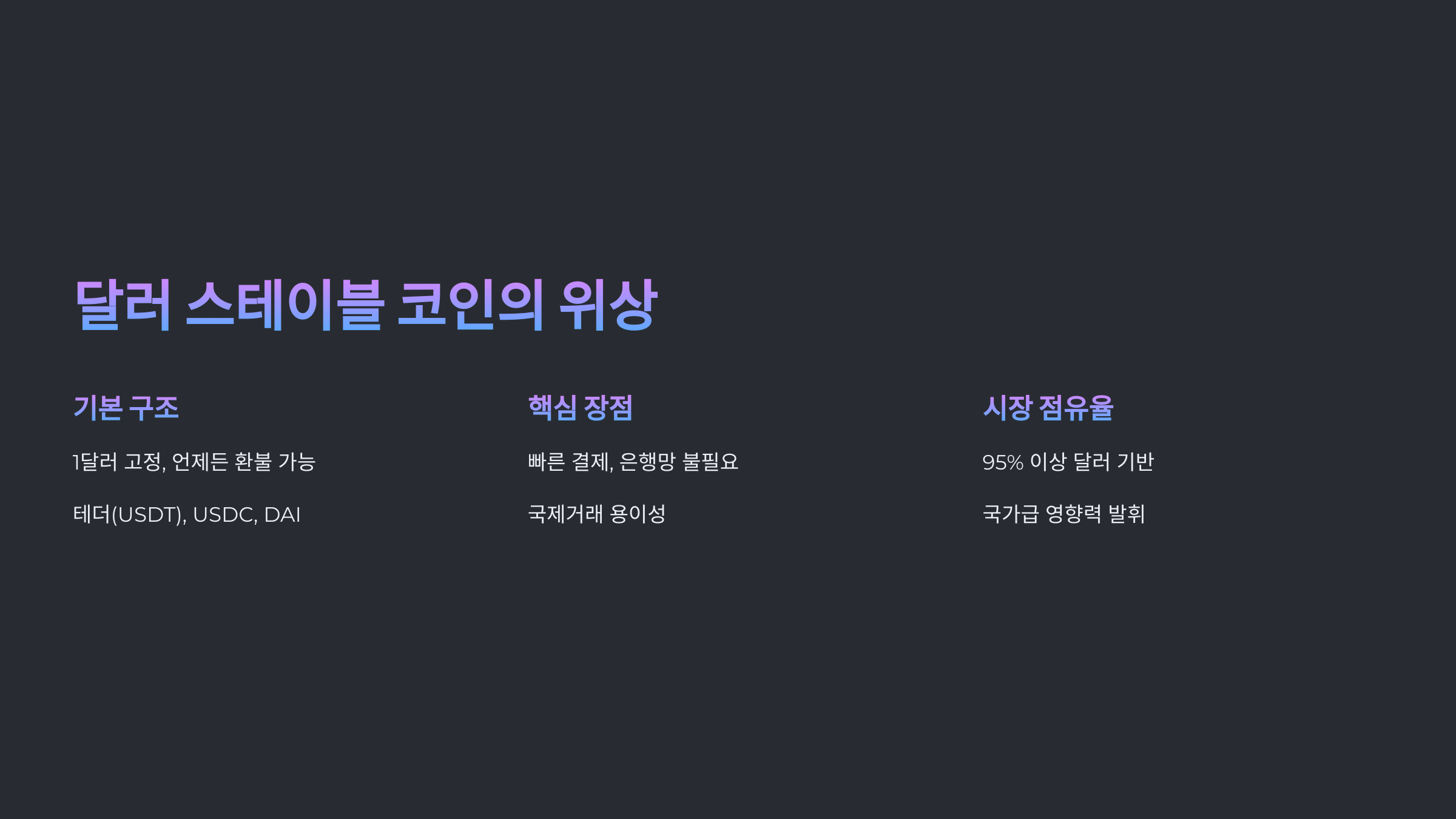 | 시장 점유율 | 95% 이상을 달러 기반 스테이블 코인이 차지 |
