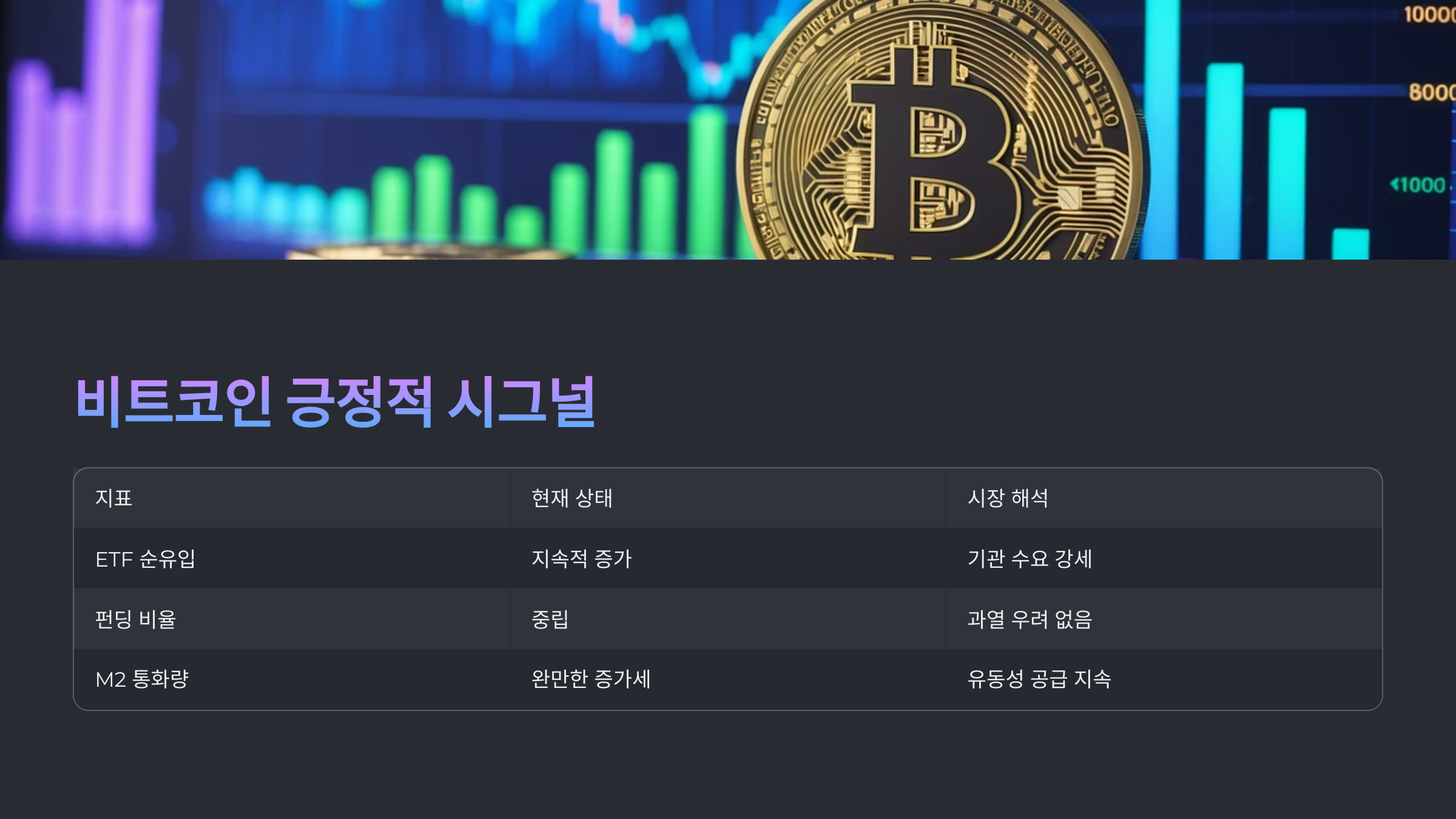 | ETF 순유입 | 지속적 증가 | 기관 수요 강세 |
