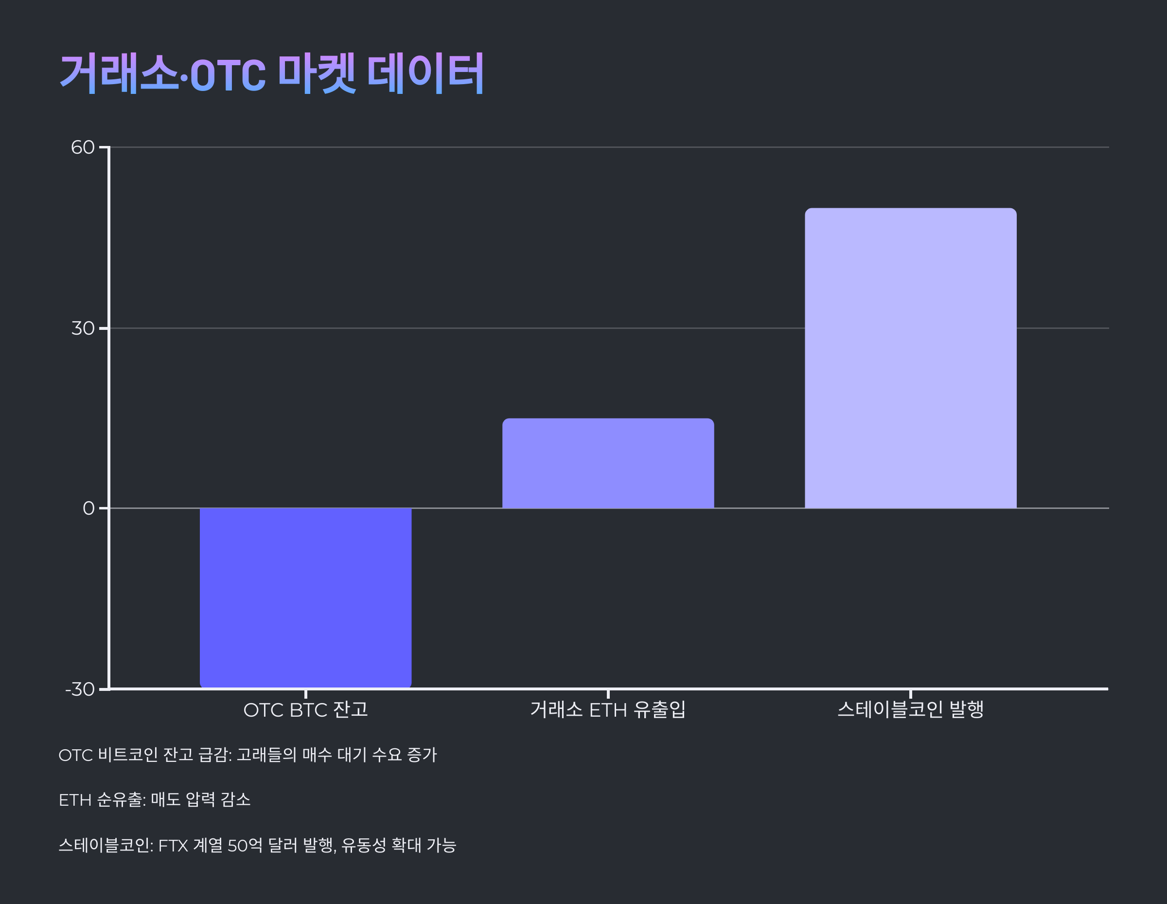 | OTC BTC 잔고 | 지속적 감소 | 매수 대기 수요 증가 |