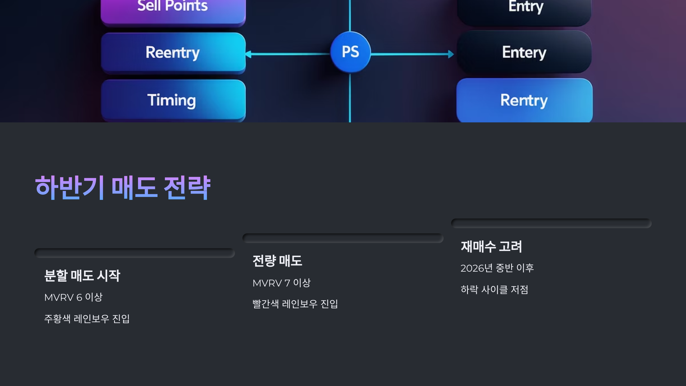 | 분할 매도 시작 | MVRV 6 이상, 주황색 레인보우 진입 시점부터 10~20%씩 분할 매도 |