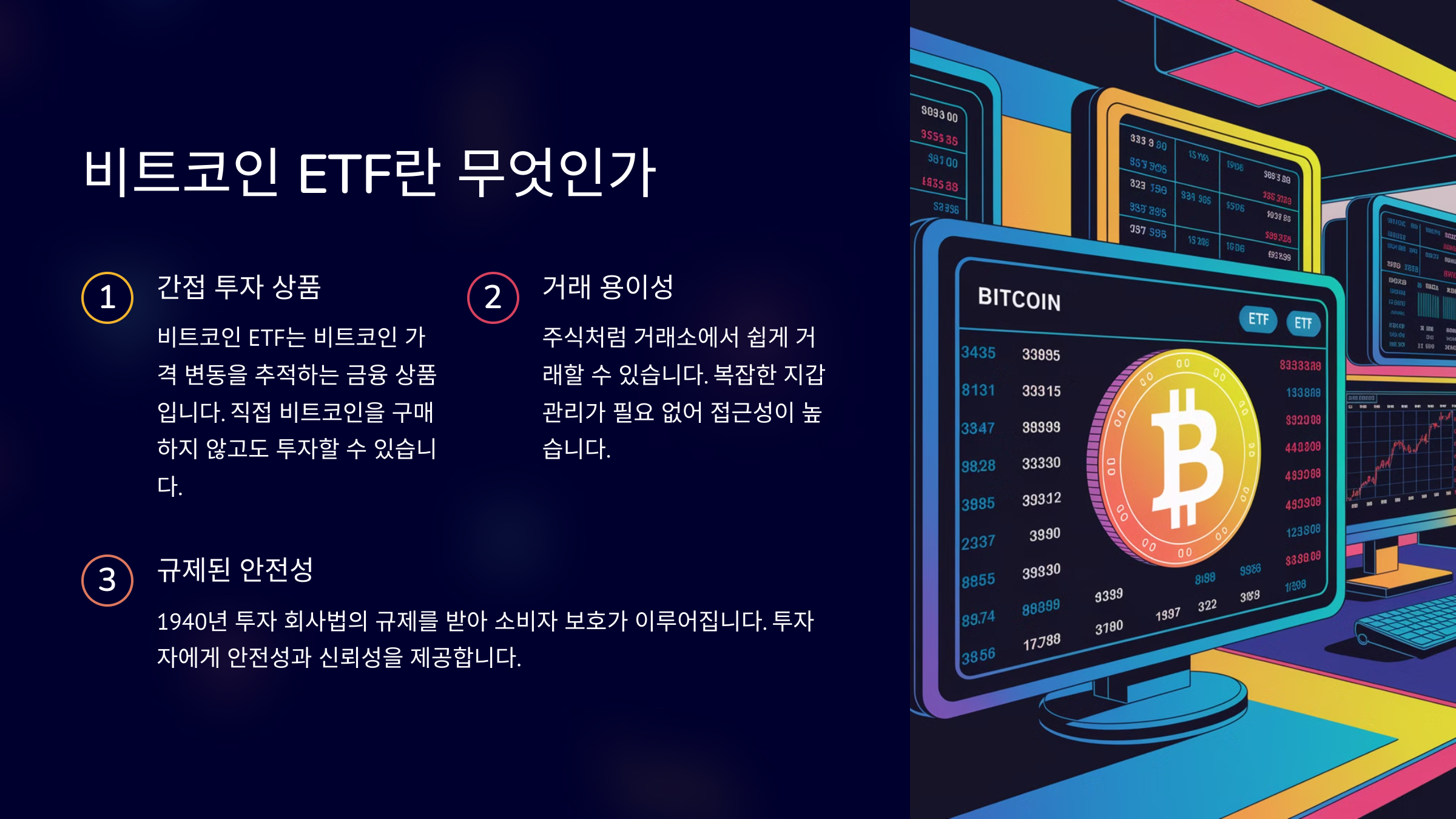 이 ETF는 주식처럼 거래소에서 쉽게 거래할 수 있는 장점이 있습니다. 따라서 복잡한 지갑 관리가 필요 없어 개인 투자자도 간편하게 비트코인에 접근할 수 있습니다.