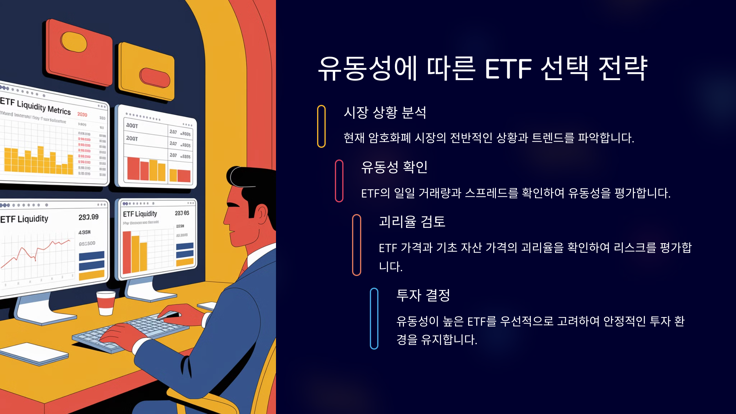 시장 상황에 따라 유동성 있는 ETF를 우선적으로 고려해야 합니다. 유동성이 높은 ETF는 단기 거래자에게 매력적일 수 있지만, 괴리율과 같은 리스크를 고려해야 하며, 안정적인 투자 환경을 유지하기 위해 유동성 공급자의 역할도 중요합니다.