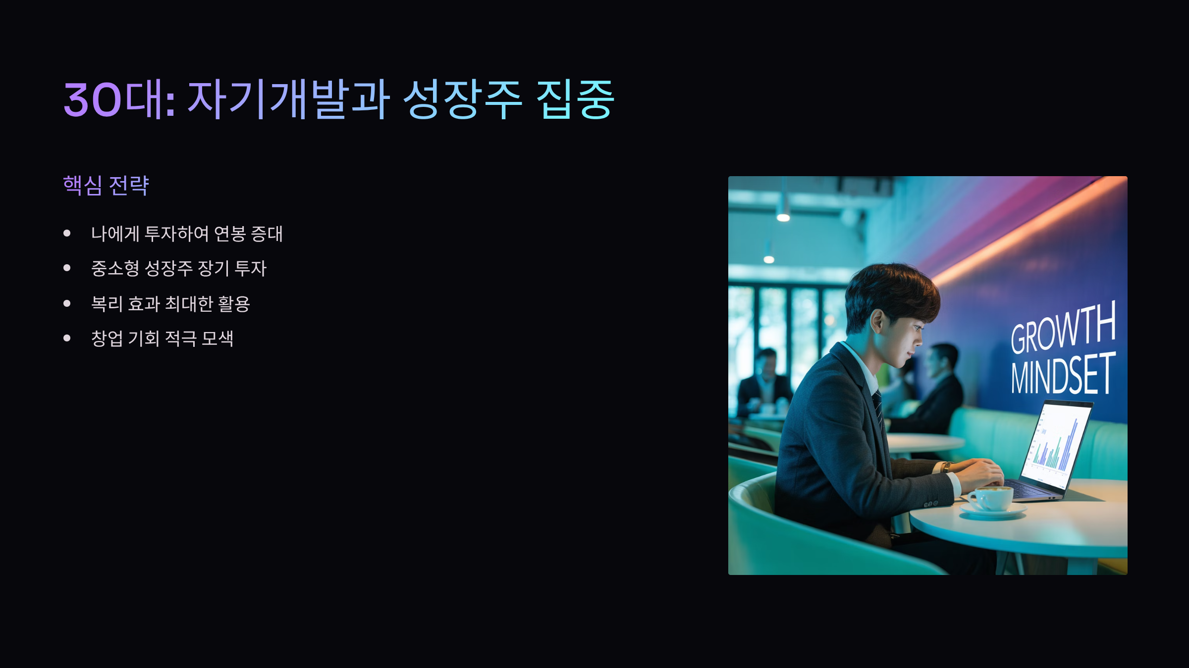 - 30대: 시간이라는 무기를 활용해 성장주에 장기 투자 + 자기 개발