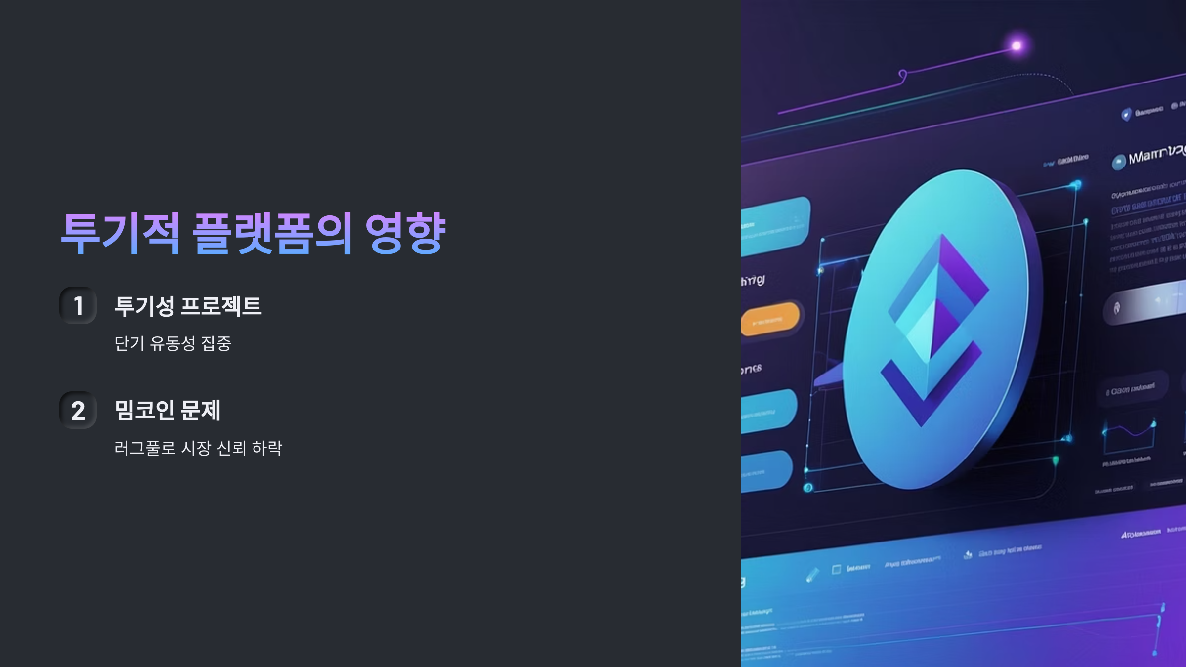 종종 ‘러그풀’ 형태로 시장 신뢰를 떨어뜨립니다. 장기적인 알트코인 시장 성장에는 오히려 부정적 영향을 미칩니다.