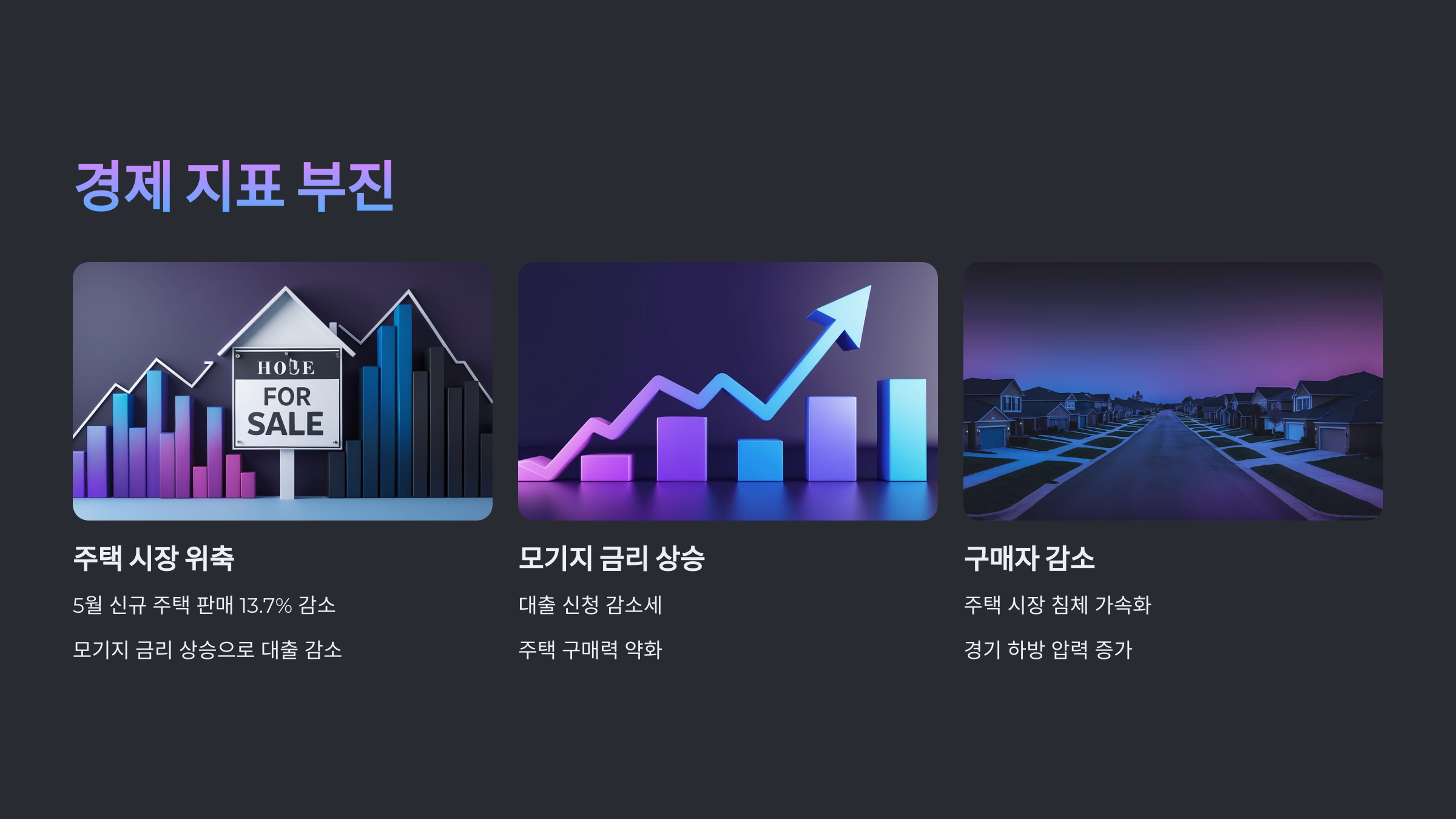 이처럼 주택 시장의 위축은 소비 위축으로 이어질 수 있어, 경기 둔화 우려를 키우고 있습니다.