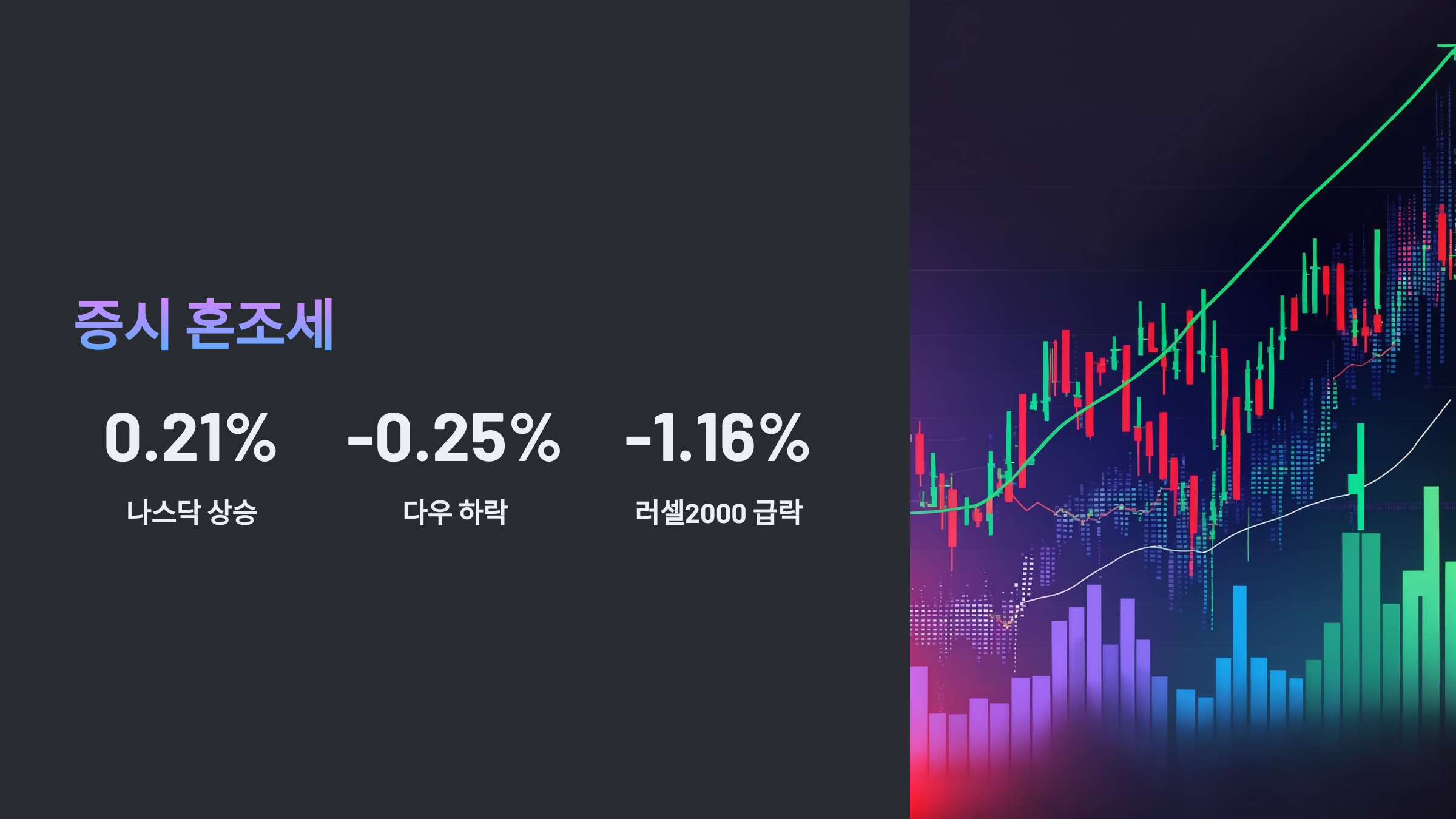 다우는 0.25% 하락, 러셀2000은 1.16% 급락하면서 전체 시장의 온도는 엇갈렸습니다.