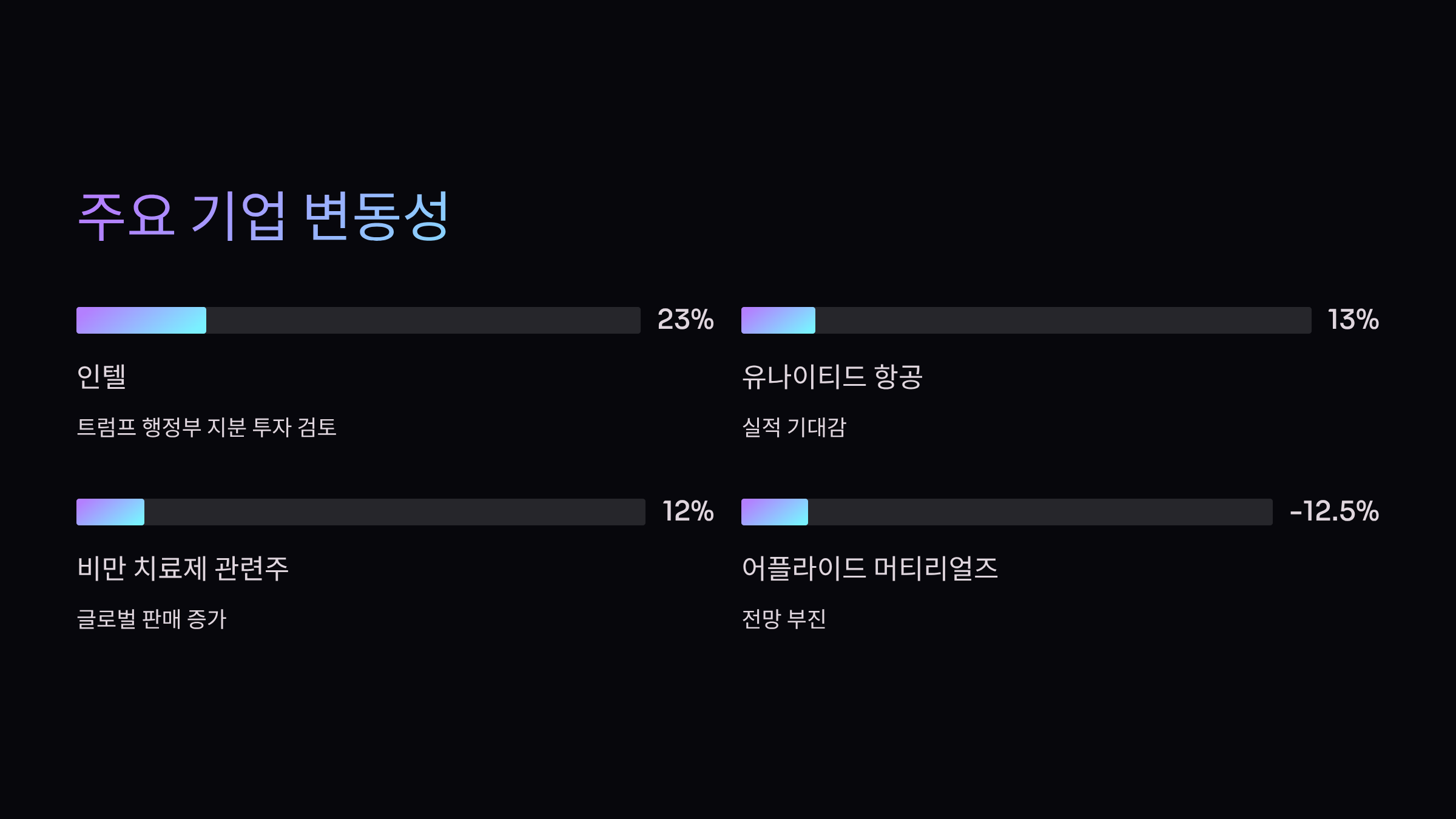 | 인텔 | +23% | 정부 지분 투자 검토 |