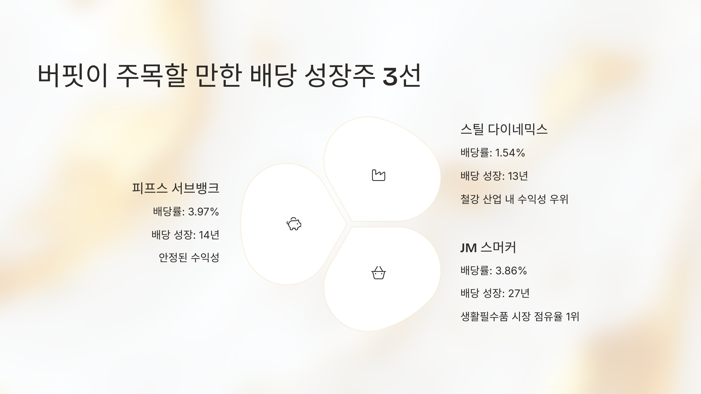 버핏은 배당 성장 기업을 좋아하죠. 단순히 배당을 많이 주는 게 아니라,