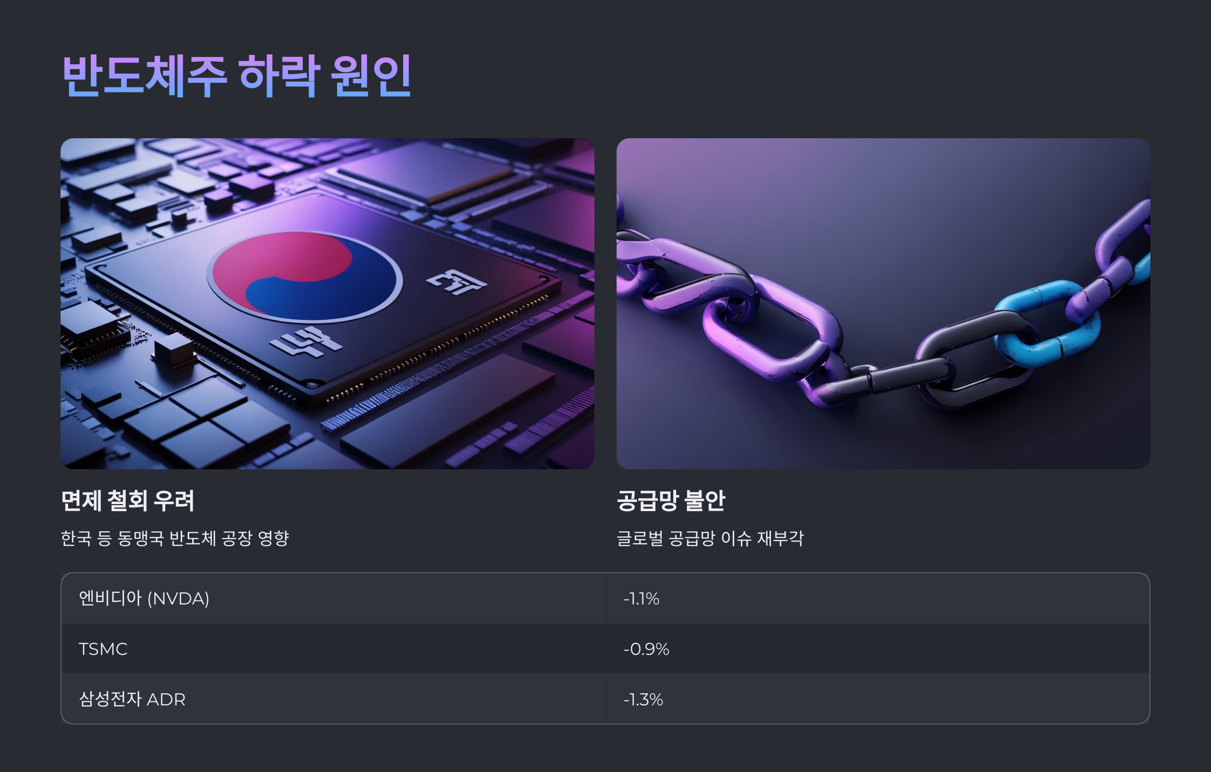 | TSMC | -0.9% | 미국 내 공장 투자 이슈 |