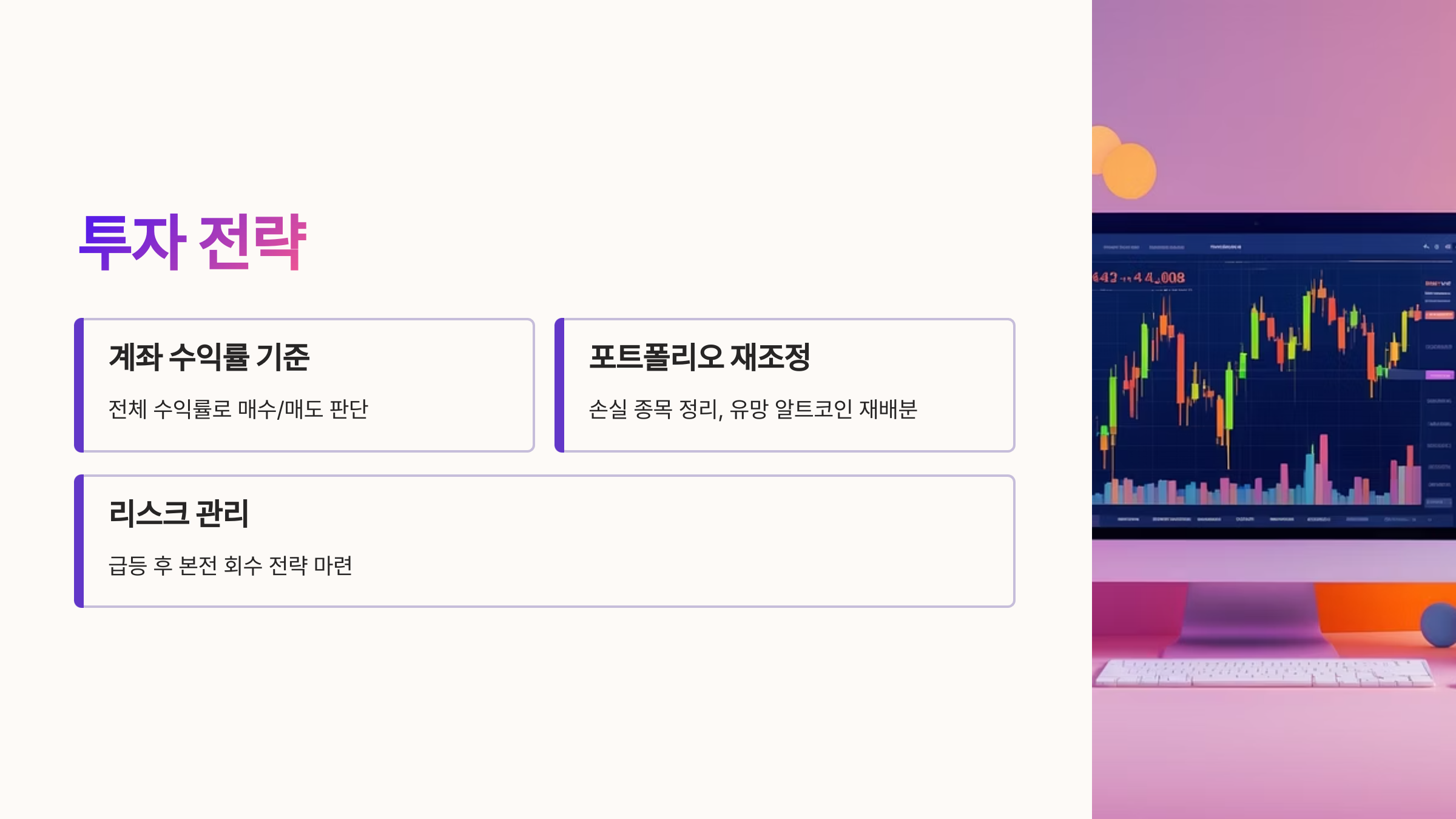 - 손실 종목은 과감히 정리하고, 유망 알트코인에 재배분