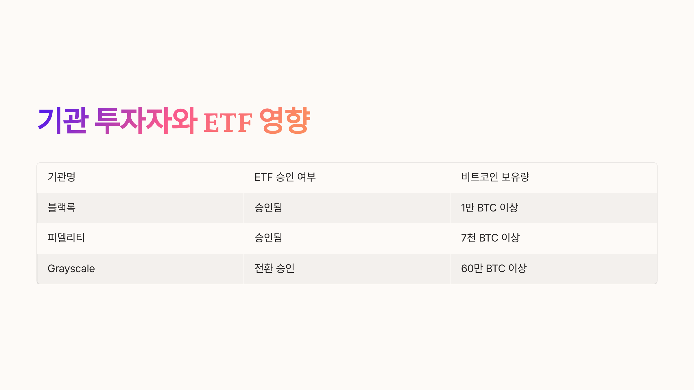 | 기관명 | ETF 승인 여부 | 비트코인 보유량 |