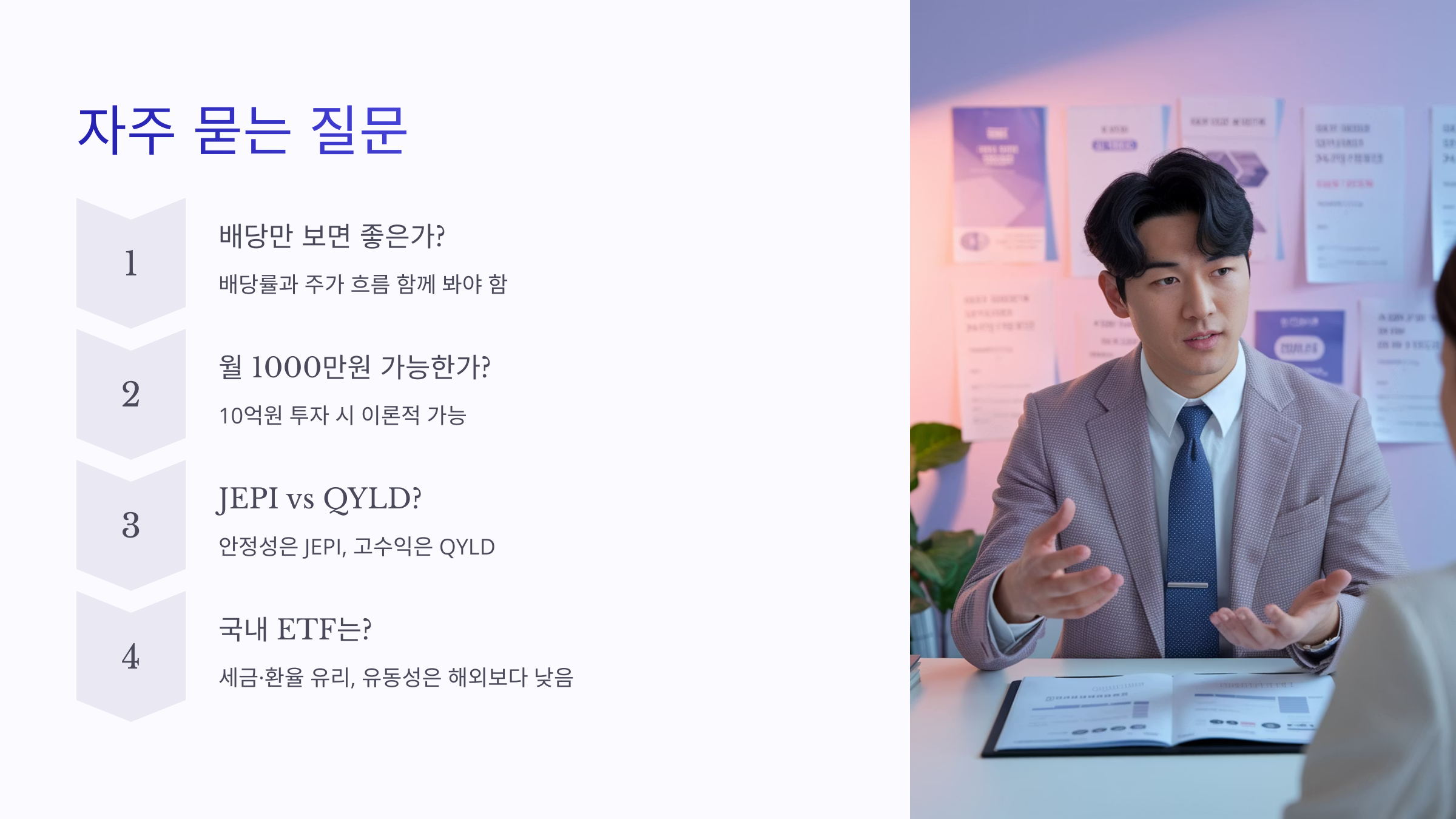 | JEPQ | 약 9% | 5.1% | JEPI의 나스닥 버전, 균형 전략 |