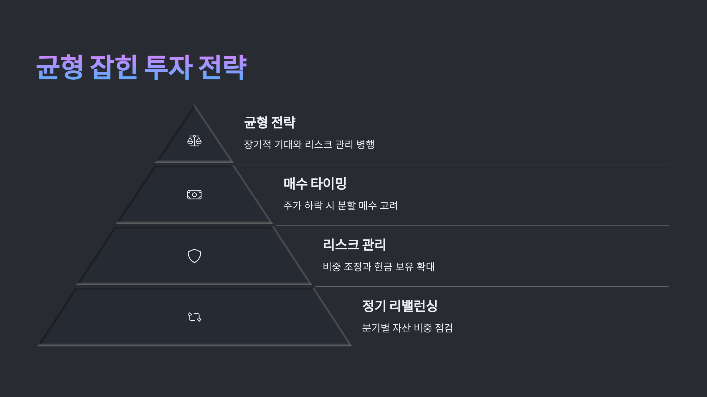 • 정기적 리밸런싱: 분기별 자산 비중 점검