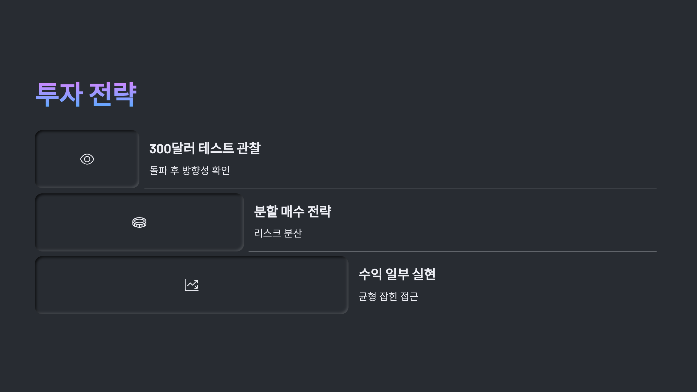 • 분할 매수 및 수익 일부 실현 전략