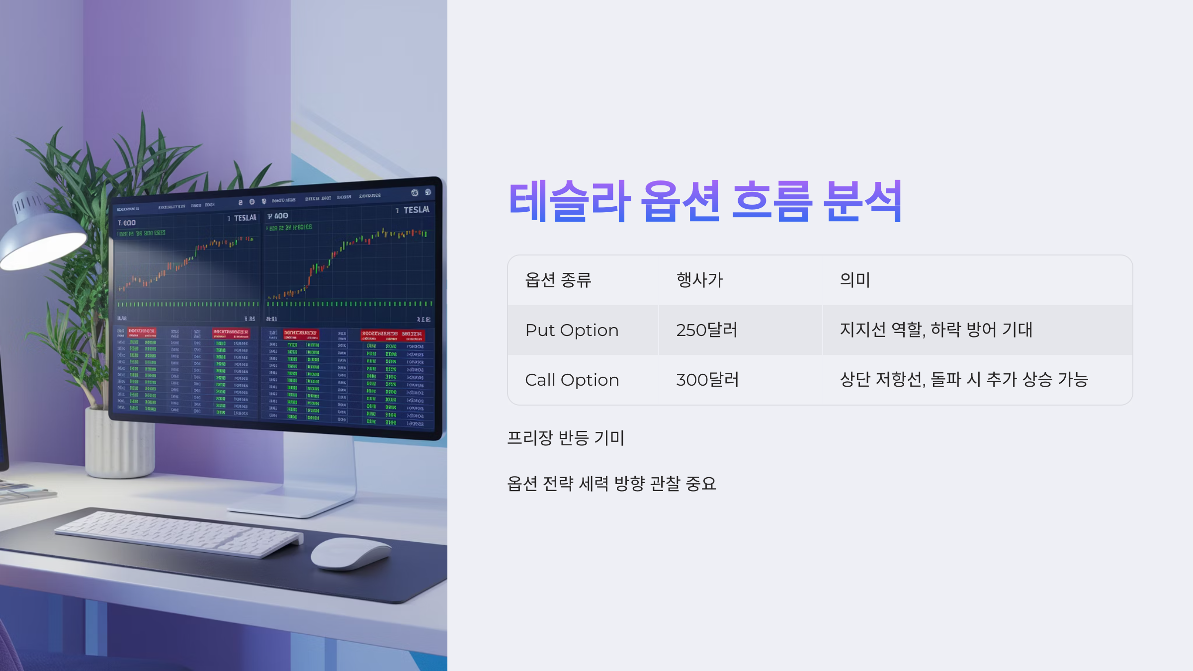 | Put Option | 250달러 | 지지선 역할, 하락 방어 기대 |