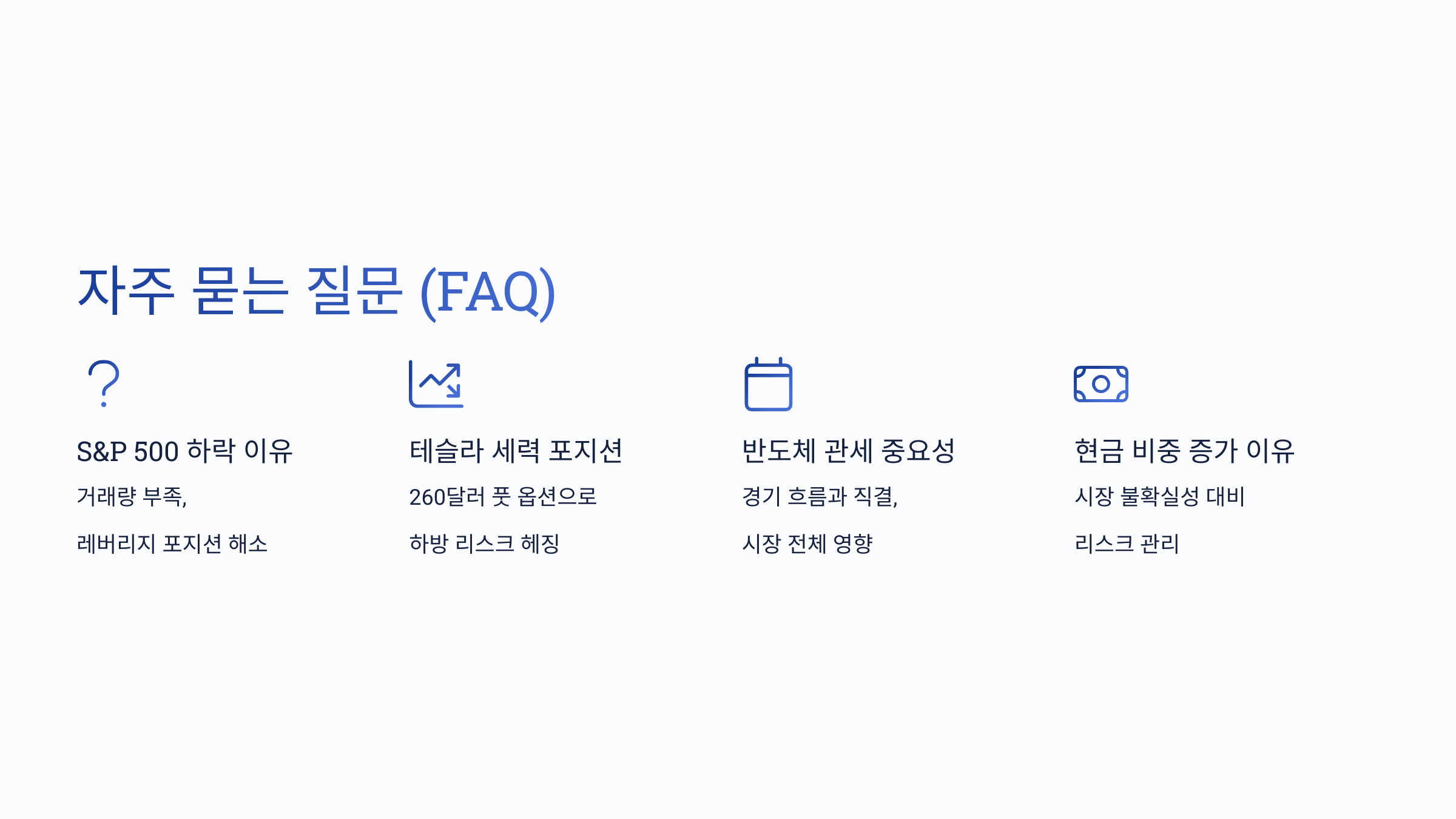 - 불확실성 해소 전까지 보수적인 현금 비중 유지 권장