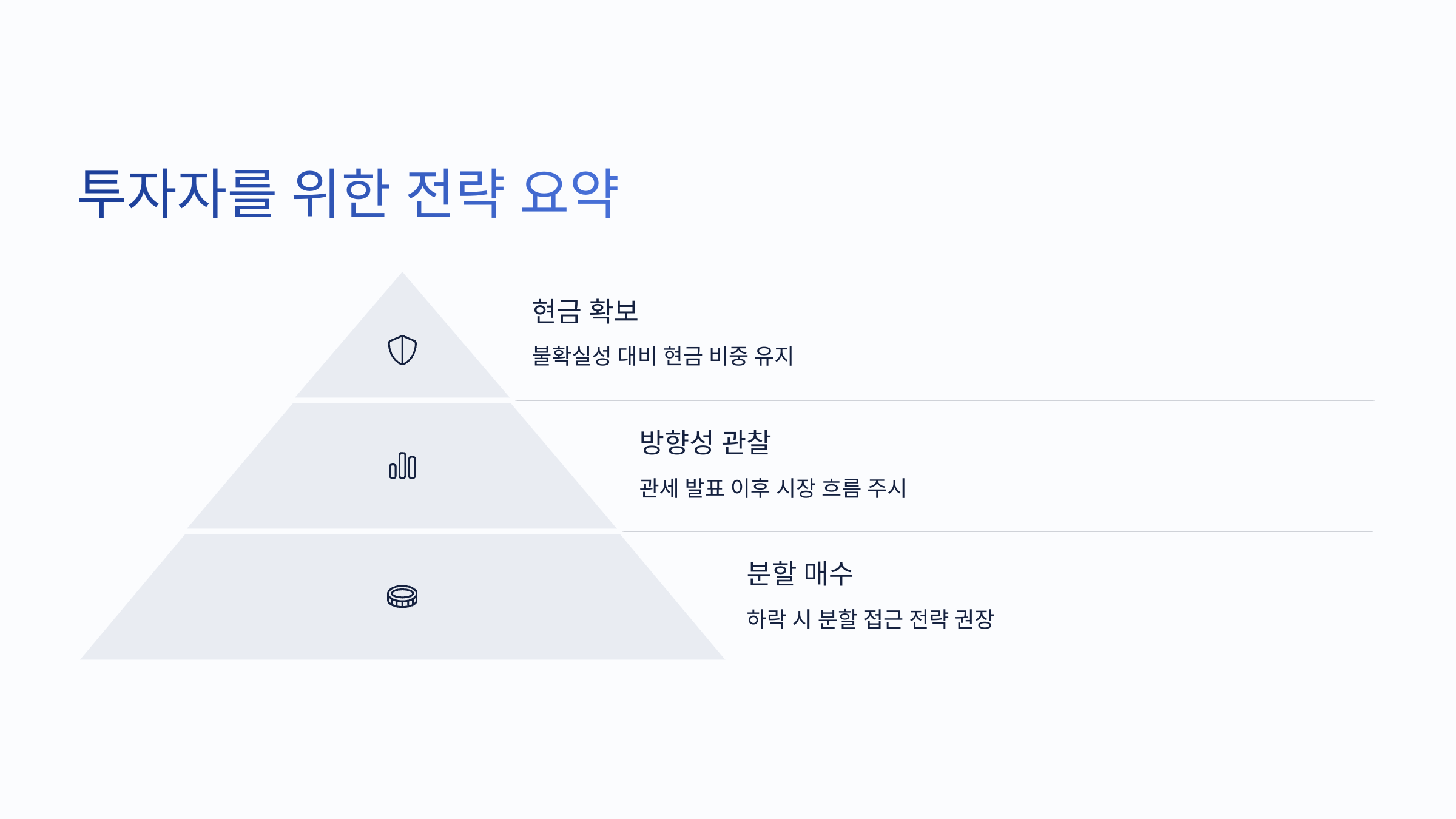 • 단기 매매보다는 현금 확보 및 분할 접근 전략 권장