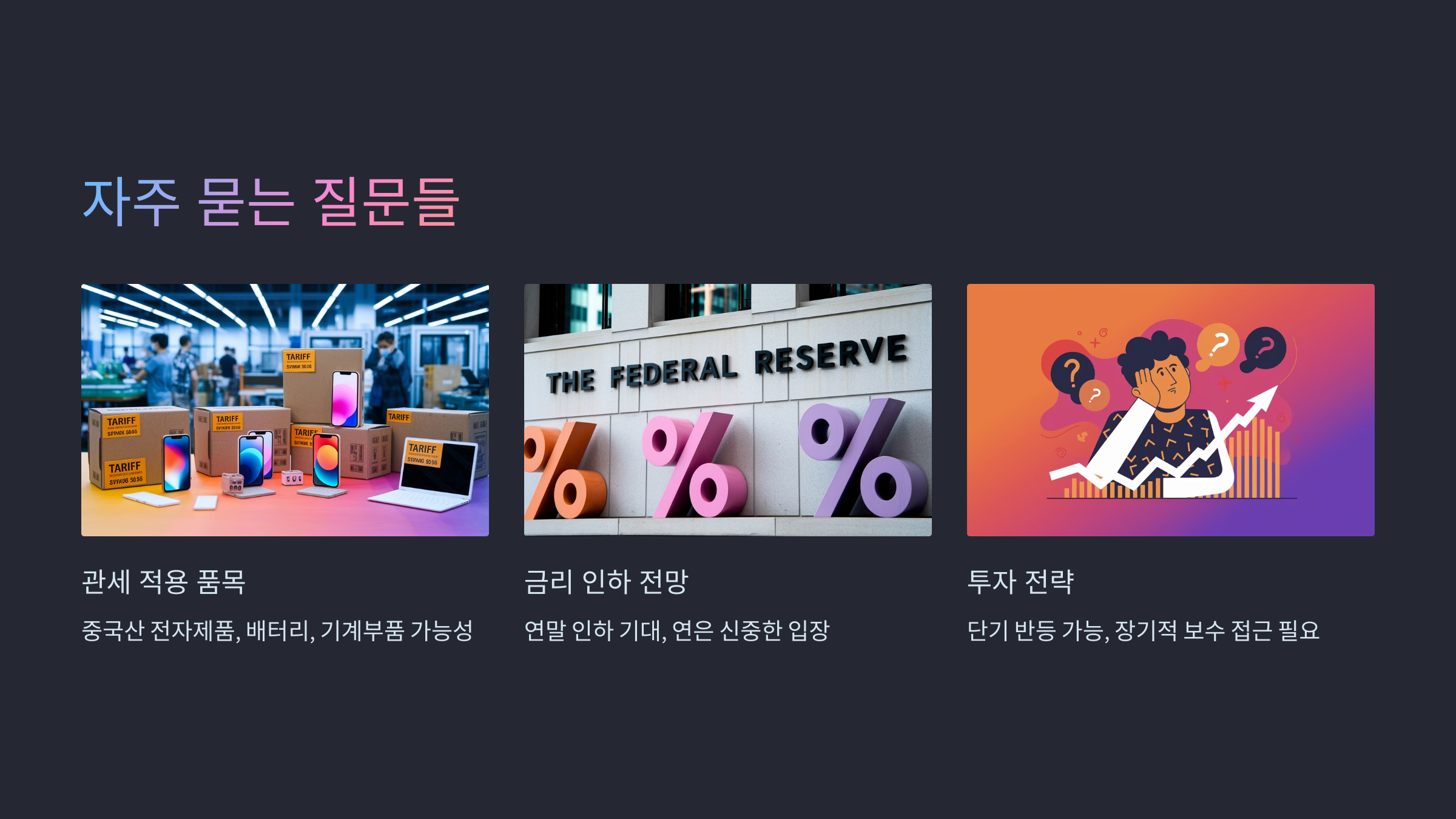 장기적으로는 관세 이슈가 해소될 때까지는 보수적인 접근이 필요합니다.