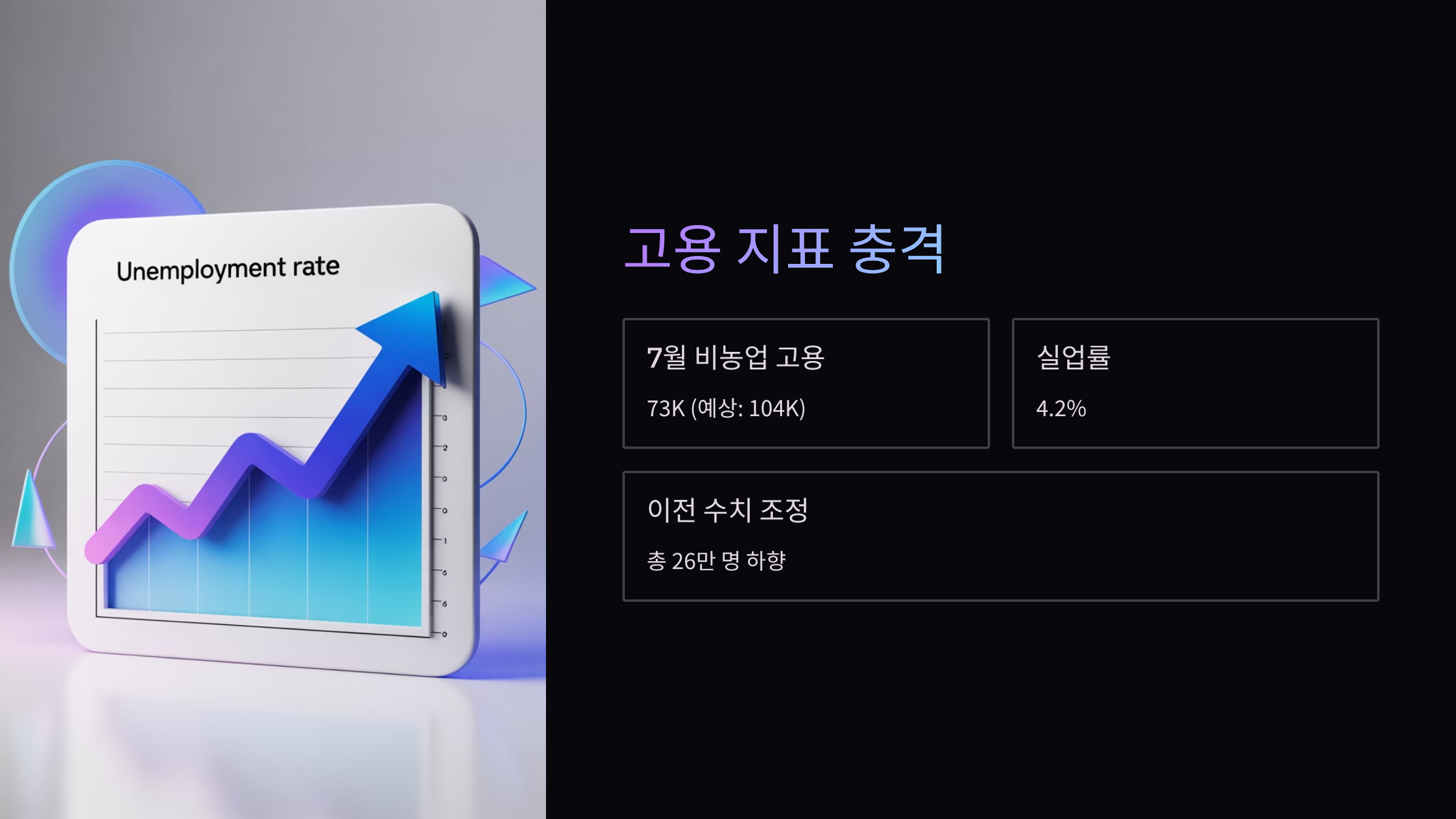 - 7월 비농업 고용: 73K (예상: 104K, 이전: 147K→14K)