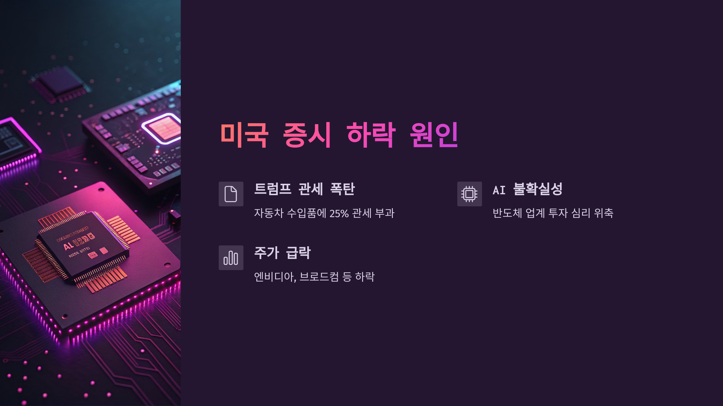 | 자동차 수입품에 25% 관세 부과 | 불확실성 확대, 주가 하락 | 엔비디아, 브로드컴 등 급락 |
