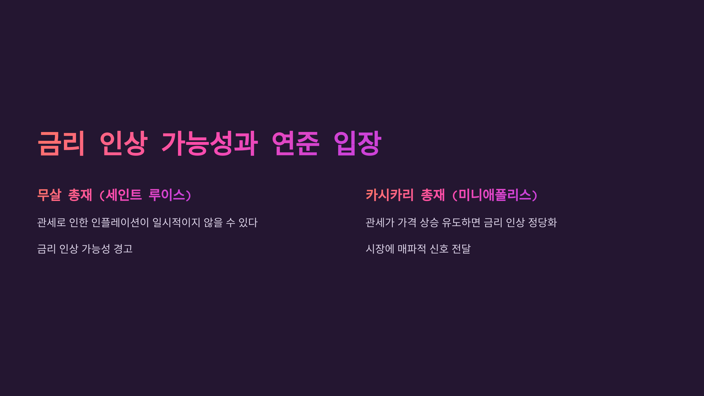 | 카시카리 총재 (미니애폴리스) | 관세가 가격 상승을 유도하면 금리 인상 정당화 |