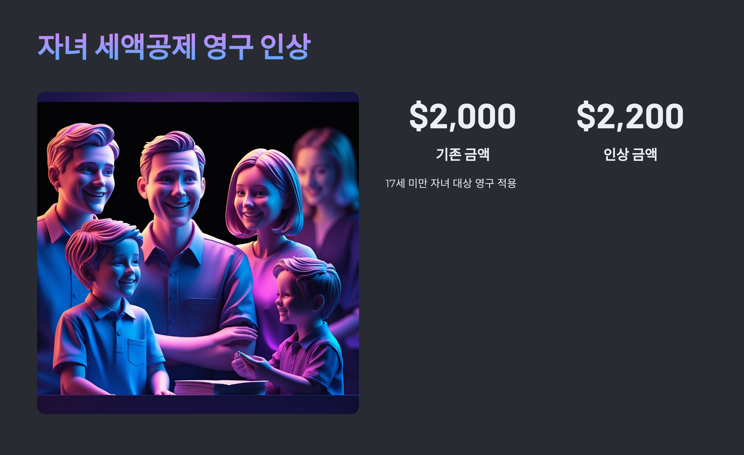 기존 자녀 세액공제는 17세 미만 자녀 1인당 2,000달러였습니다.